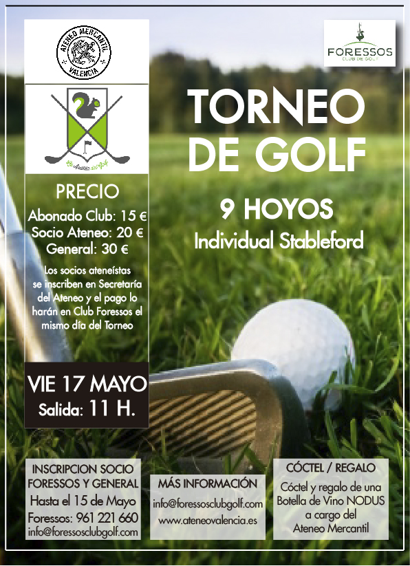 El Ateneo Mercantil de Valencia, el Foressos Club de Golf y la Ardilla del Golf han organizado un torneo de 9 hoyos el próximo viernes 17 de mayo de 2024. La salida se producirá a las 11 de la mañana y el torneo está estipulado para 50 jugadores, en modalidad Individual Stableford. El precio de inscripción para participar en el torneo será de 20 euros para el socio del Ateneo Mercantil, 15 euros para el socio de Foressos y 30 euros para el público general. Los socios ateneístas se inscribirán en Secretaría del Ateneo Mercantil, pero deberán realizar el pago en Foressos Club de Golf el mismo día del torneo.