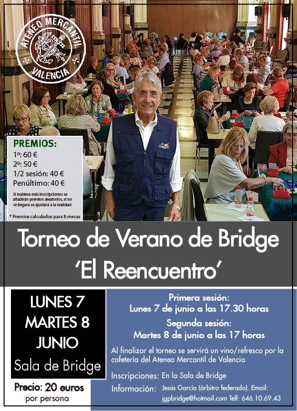 Llega una nueva edición del Tradicional Campeonato de Verano de Bridge, que tras la pandemia regresa con el sobre nombre de 'El Reencuentro', y que se disputará en dos sesiones: el lunes 7 de junio, a las 17:30 horas, y el martes 8 de junio, a las 17 horas, en la Sala de Bridge. Recordarles a todos los partipantes que la inscripción es de 20 euros por persona, da derecho a jugar el Torneo y al finalizar el torneo se servirá un vino/refresco por parte de la cafetería del Ateneo Mercantil de Valencia. Si quiere apuntarse, debe hacer la inscripción en la Sala de Bridge y para más información hay que dirigirse al árbitro federado, Jesús García, al email: jgpbridge@hotmail.com o bien al teléfono: 646.10.69.43.