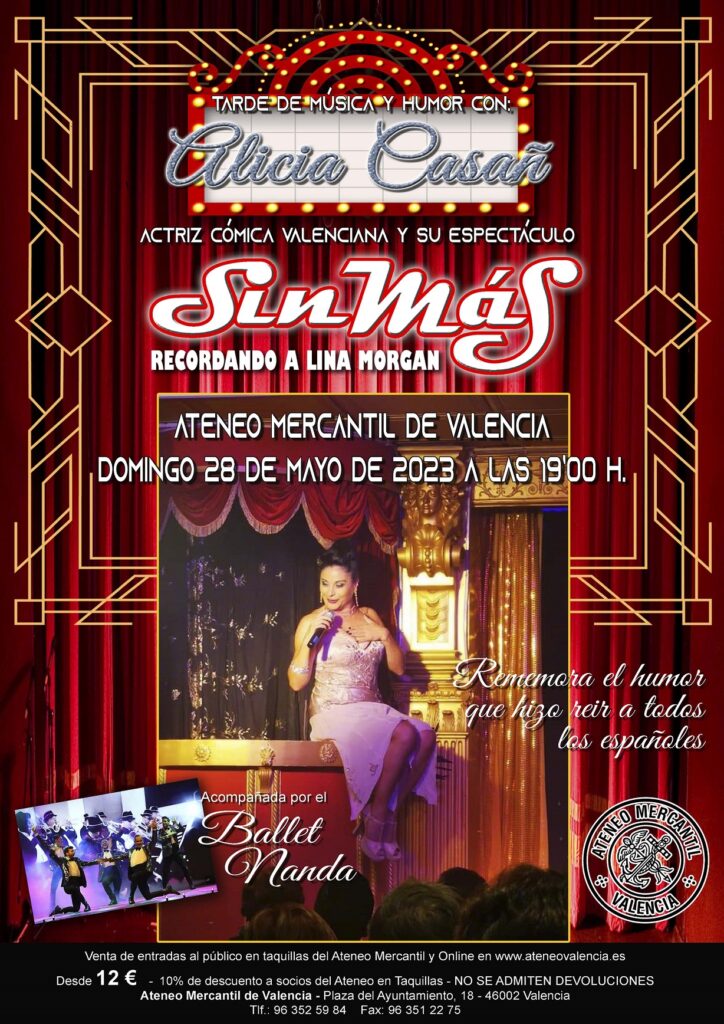 El Ateneo Mercantil de Valencia ha organizado un espectáculo de comedia muy especial en el que el humor y las risas estás aseguradas. Llega hasta el Teatro Ateneo uno de los mejores Tributos a Lina Morgan, el espectáculo 'Sin Más', una tarde de música y humor con la actriz cómica valenciana, Alicia Casañ, a quien le acompañá el Ballet Nanda.