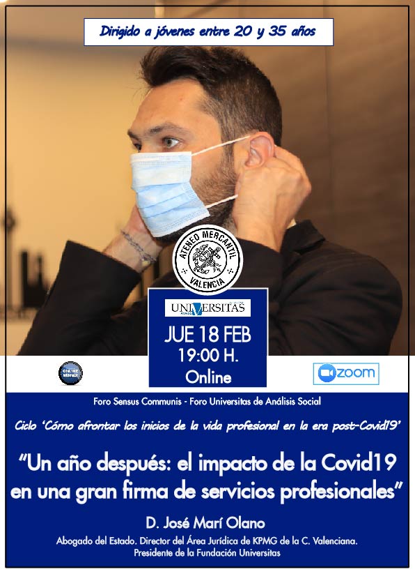 La conferencia está dirigida especialmente a jóvenes entre 20 y 35 años y se titula "Un año después: el impacto de la Covid19 en una gran firma de servicios profesionales" y el ponente será D. José Marí Olano, que es abogado del Estado, director del Área Jurídica de KPMG de la Comunitat Valenciana y presidente de la Fundación Universitas. Este encuentro será posible gracias al trabajo conjunto del Foro Sensus Communis y la Fundación Universitas.