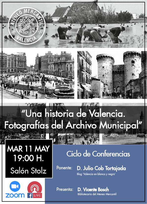 El Ciclo de Conferencias regresa al Ateneo Mercantil el próximo martes 11 de mayo a las 19 horas en el Salón Stolz del Ateneo Mercantil con una ponencia que se ofrecerá tanto en presencial como en online y en la que analizará la evolución de Valencia gracias a las magníficas fotografías que nos aporta el Archivo Municipal y que se recogen en un blog de gran prestigio como es el de 'Valencia en Blanco y Negro". La conferencia llega bajo el título: "Una historia de Valencia. Fotografías del Archivo Municipal" y el ponente será D. Julio Cob Tortajada, que es el autor del Blog 'Valencia en Blanco y Negro".