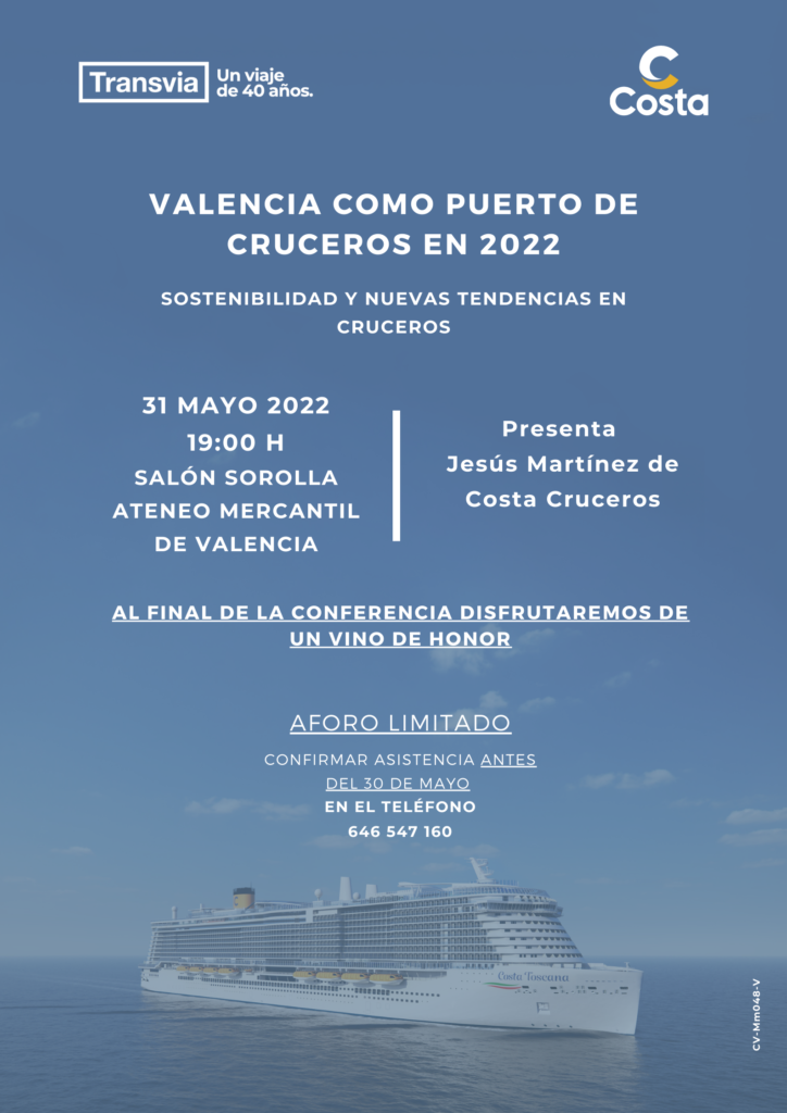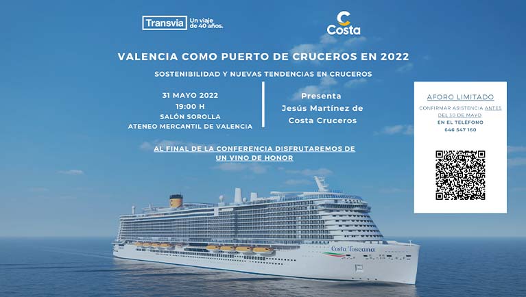 El Grupo Tranvia Viajes y Costa Cruceros han organizado esta conferencia el próximo martes 31 de mayo a las 19 horas en el Salón Sorolla en la que hablarán sobre las últimas novedades en Cruceros. Bajo el título "Valencia como puerto de cruceros en 2022: sostenibilidad y nuevas tendencias en cruceros" nos traeran las últimas novedades y opiniones en viajes con los mejores barcos de la actualidad y los destinos más solicitados por el público.