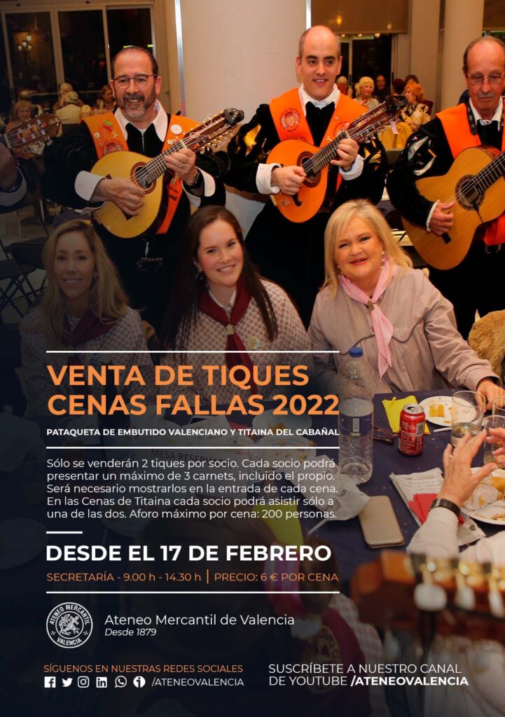 El Ateneo Mercantil de Valencia arranca la venta de tiques para las cenas sociales de las Fallas 2022 el próximo jueves 17 de febrero en Secretaría en horario de mañanas de 9 a 14.30 horas y se pueden adquirir boletos para las dos cenas de pataqueta de titaina del Cabanyal (10 y 12 de marzo) y para la cena de pataqueta valenciana de embutido (11 de marzo). Recordarles que las cenas comenzarán a las 21 horas y se realizarán en el Salón Noble.