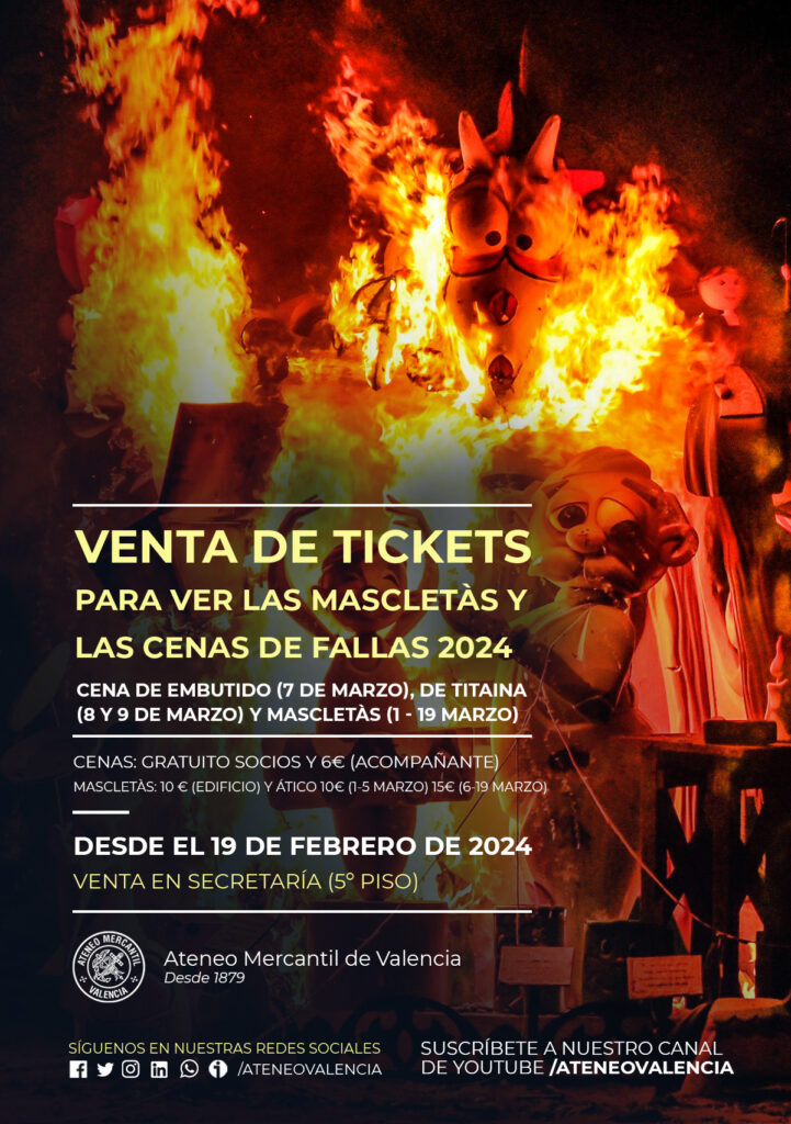 El Ateneo Mercantil de Valencia arranca la venta de tiques para las cenas sociales de las Fallas 2024 el próximo lunes 19 de febrero en Secretaría en horario de mañanas de 9 a 14.30 horas y se pueden adquirir boletos para las cenas de pataqueta de titaina del Cabanyal (8 y 9 de marzo) y para la cena de pataqueta valenciana de embutido (7 de marzo). Recordarles que las cenas comenzarán a las 21 horas y se realizarán en el Salón Noble.