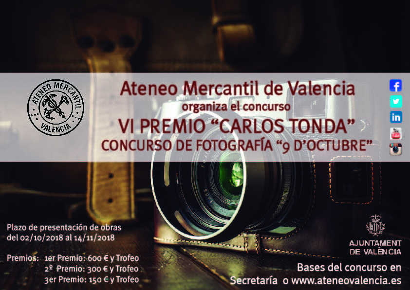 El Concurso de Fotografía 9 d'Octubre - Premio Carlos Tonda llega a su sexta edición y estará abierto para los participantes desde el 2 de octubre al 14 de noviembre, ambos inclusive. En ese periodo de tiempo se recibirán las fotografías participantes. Pueden participar todos los aficionados y profesionales de la fotografía, residentes en el territorio nacional y los trabajos tienen que estar relacionados con el tema de Fiestas, Tradiciones y Costumbres Valencianas.