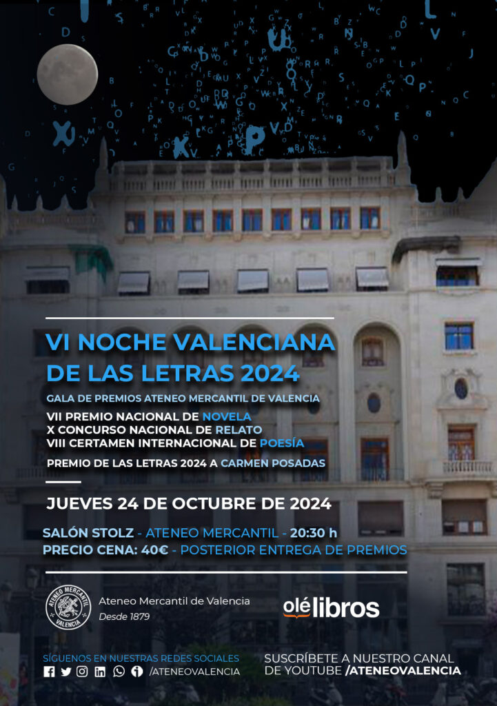 El Ateneo Mercantil de Valencia se pone de gala este jueves 24 de octubre para otorgar sus premios literarios en la VI edición de la Noche Valenciana de las Letras donde se darán a conocer los ganadores del 'VII Premio Nacional de Novela Ateneo Mercantil de Valencia', el 'X Concurso Nacional de Relato' y el 'VIII Certamen de Poesía'.