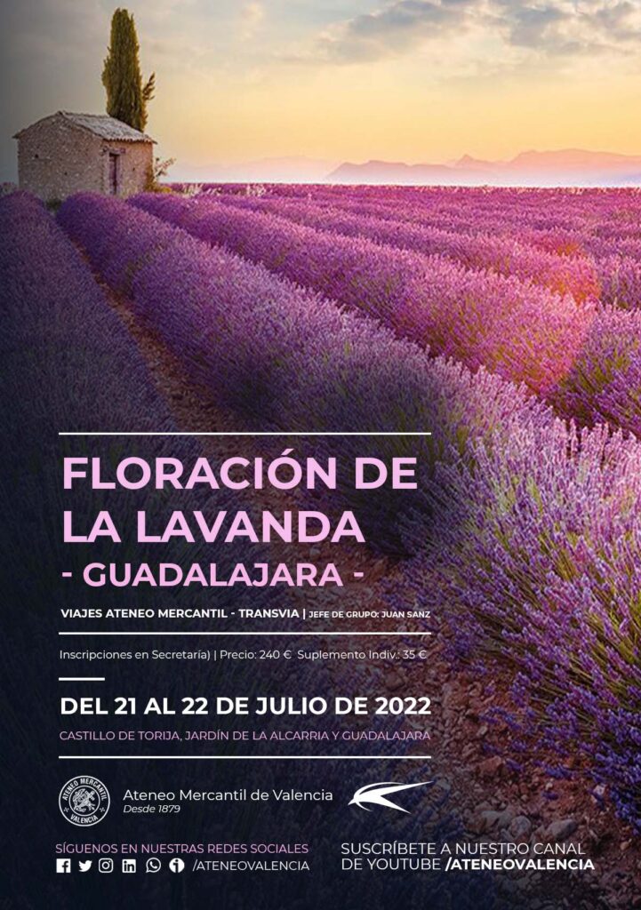 El Ateneo Mercantil ha programado un nuevo viaje para sus socios y acompañantes que les llevará a Guadalajara donde se conocerá de cerca la floración y todo el trabajo de la Lavanda. Es una obligada escapada para ver la floración de los campos de lavanda que cada mes de julio hace que miles de personas viajen a la región de Guadalajara, en los alrededores de la localidad de Brihuega para ver este momento único en los campos manchegos.