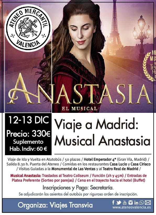 El Ateneo Mercantil ha programado un viaje a Madrid estas Navidades para disfrutar de uno de los mejores musicales que hay en la actualidad en la capital de España, 'Anastasia'. Un musical que les transportará desde el ocaso del Imperio ruso hasta la euforia de París en los años 20. Anastasia narra la apasionante aventura de la hija pequeña de los Romanov que, según la leyenda, escapó de la revolución bolchevique y viajó de San Pertersburgo hasta París, para encontrar allí su verdadera identidad, y convertirse en la dueña de su destino.