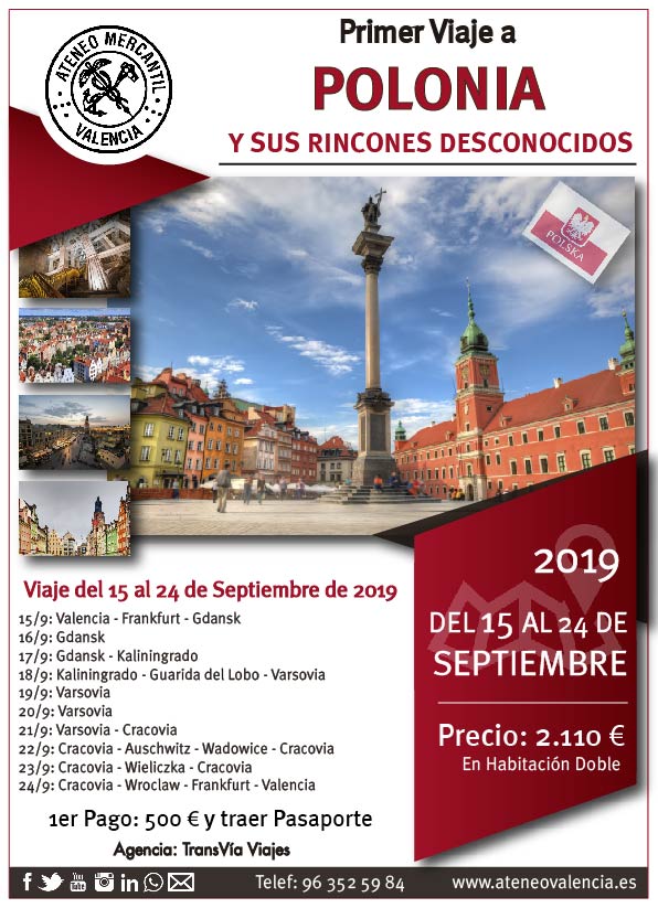 Viaja con el Ateneo Mercantil de Valencia a Polonia del 15 al 24 de septiembre y cumple uno de tus sueños al oder conocer uno de los grandes países europeos. Un país desconocido para muchas personas pero con una gran historia detrás y sobre todo con rincones maravillosos que son una delicia para los viajeros.
