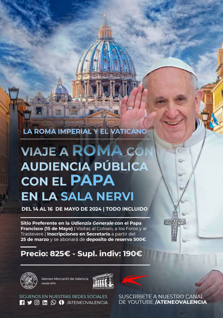 El Ateneo Mercantil de Valencia junto a su agencia de viajes de confianza TransVía - Mucho más que viajes han organizado un viaje para el próximo mes de mayo (del 14 al 16 de mayo de 2024) en el que se visitará Roma para conocer con guías especializados el Coliseo, los Foros Romanos, el Trastevere y el Vaticano.