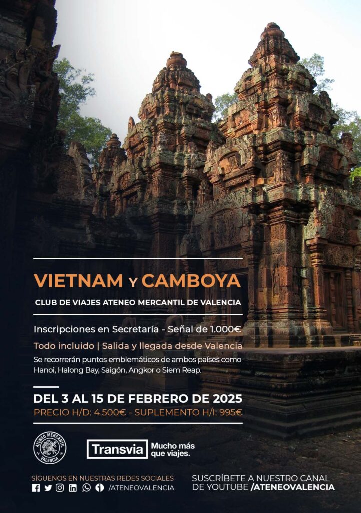 El Ateneo Mercantil de Valencia organiza junto a Transvía Mucho más que viajes el Viaje a Vietnam y Camboya. Un viaje que se realizará del 3 al 15 de febrero de 2025 y en el que se recorrerán puntos emblemáticos de los dos países como Hanoi, Halong Bay, Saigón, Angkor o Siem Reap. El vuelo saldrá desde Valencia y el viaje es en modalidad de Todo Incluido.