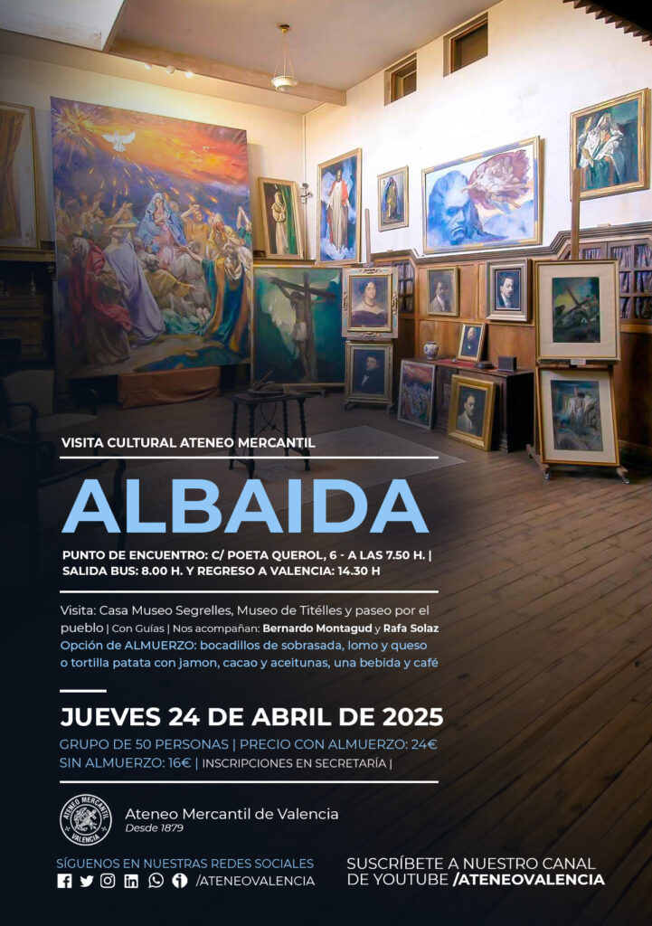 El Ateneo Mercantil de Valencia organiza una visita cultural a Albaida el próximo Jueves, 24 de abril de 2025 donde descubriremos su riqueza histórica y artística de la mano de expertos y guías locales en la visita a los dos museos de la población.