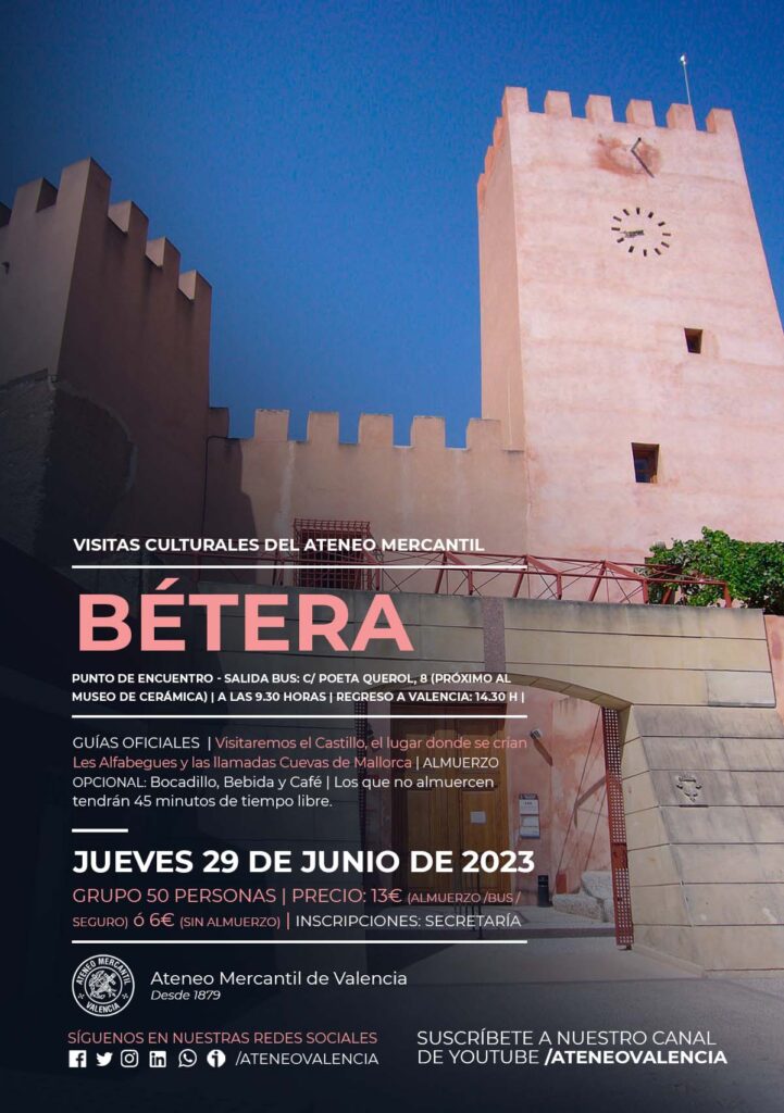 El Ateneo Mercantil de Valencia ha organizado una nueva visita cultural para este mes de junio que llevará a 50 socios a la localidad de Bétera para conocer de cerca su recién remodelado castillo, para ver in situ el lugar donde se crían les 'alfabegues' y además, de las cuevas de Mallorca. Una visita en la que se da la opción de almorzar, mientras que el que no quiera hacerlo tendrá 45 minutos de tiempo libre para ver la población.