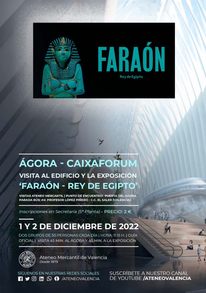 El Ateneo Mercantil de Valencia ha programado dos visitas culturales para el mes de diciembre para sus socios y socias y la primera de ellas será al Ágora de la Ciudad de las Ciencias de Valencia para ver hacer una visita guiada de 45 minutos con guías oficiales para conocer el edificio y otra visita de 45 minutos para ver la Exposición 'Faraón. Rey de Egipto'.