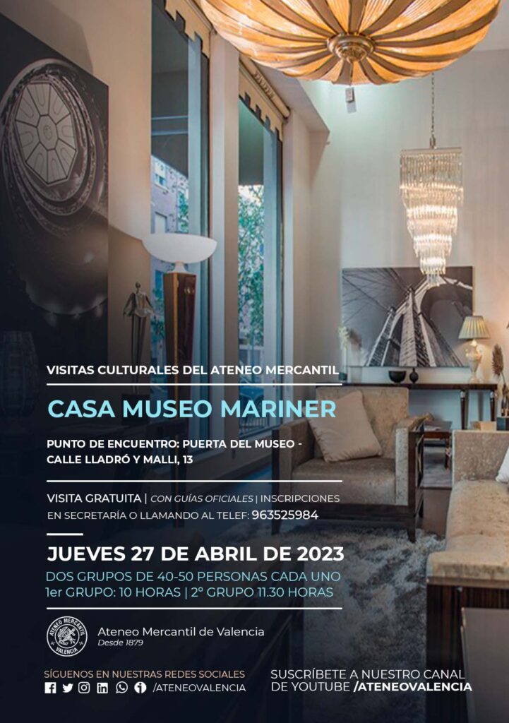 El Ateneo Mercantil de Valencia ha organizado una visita cultural gratuita para sus socios y acompañantes el próximo jueves 27 de abril de 2023 a la Casa Museo Mariner de Valencia. Una visita programada para dos grupos de 40-50 personas cada uno. La hora de inicio prevista para el primer grupo es a las 10 horas, mientras que el segundo grupo será a las 11.30 horas. Contaremos con guías oficiales que nos mostrarán las instalaciones de una auténtica joya como es Mariner, una empresa que data de 1893.