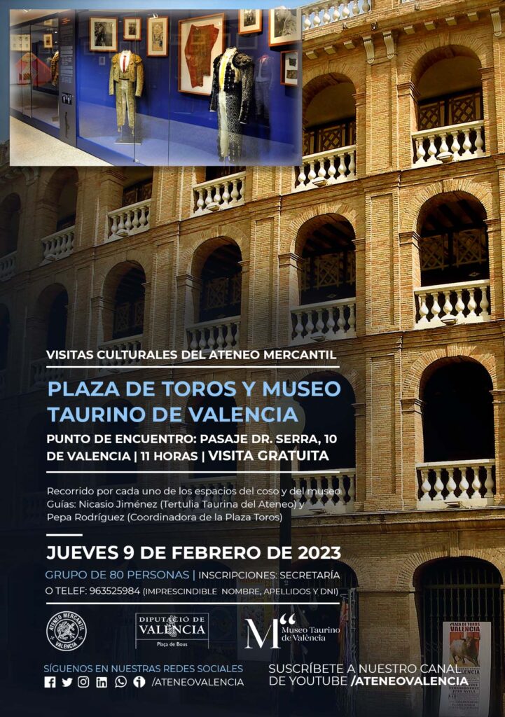 El Ateneo Mercantil de Valencia en colaboración con la Exma. Diputación de Valencia ha programado una visita cultural GRATUITA a la Plaza de Toros y el Museo Taurino de Valencia el próximo jueves 9 de febrero. El punto de encuentro será la puerta del museo taurino en el Pasaje Doctor Serra, 10 de Valencia, a las 11 horas. La visita está programada para 80 personas, un primer grupo de 40 socios visitará primero todos los rincones del coso taurino con la coordinadora de la Plaza de Toros, Pepa Rodríguez, y el otro grupo de 40 personas recorrerá el museo con el socio y compañero de la Tertulia Taurina del Ateneo, Nicasio Jiménez. Tras una hora de visita, los grupos se cambiarán y harán la visita inversa.