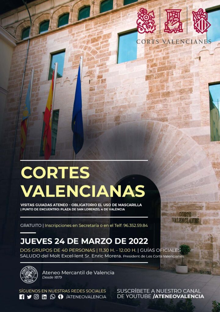 El Ateneo Mercantil de Valencia ha programado para sus socios una visita cultural gratuita a Las Cortes Valencianas el próximo jueves 24 de marzo. Será una visita para dos grupos de 40 personas cada uno, el primer grupo a las 11.30 horas y el segundo a las 12 horas. Tendremos guías oficiales y tendremos un saludo de bienvenida muy especial, ya que nos acompañará el Molt Excel·lent Sr. Enric Morera i Català, president de les Corts Valencianes.