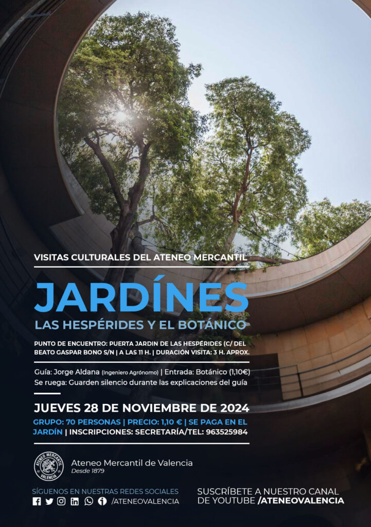El Ateneo Mercantil de Valencia ha programado una visita cultural el próximo jueves 28 de noviembre a los Jardines de Las Hespérides y El Botánico. La visita está programada para 70 socios del Ateneo y tiene un precio de 1,10 euros que es el coste de la entrada reducida al Botánico (Se abonará en la puerta del Jardín Botánico).