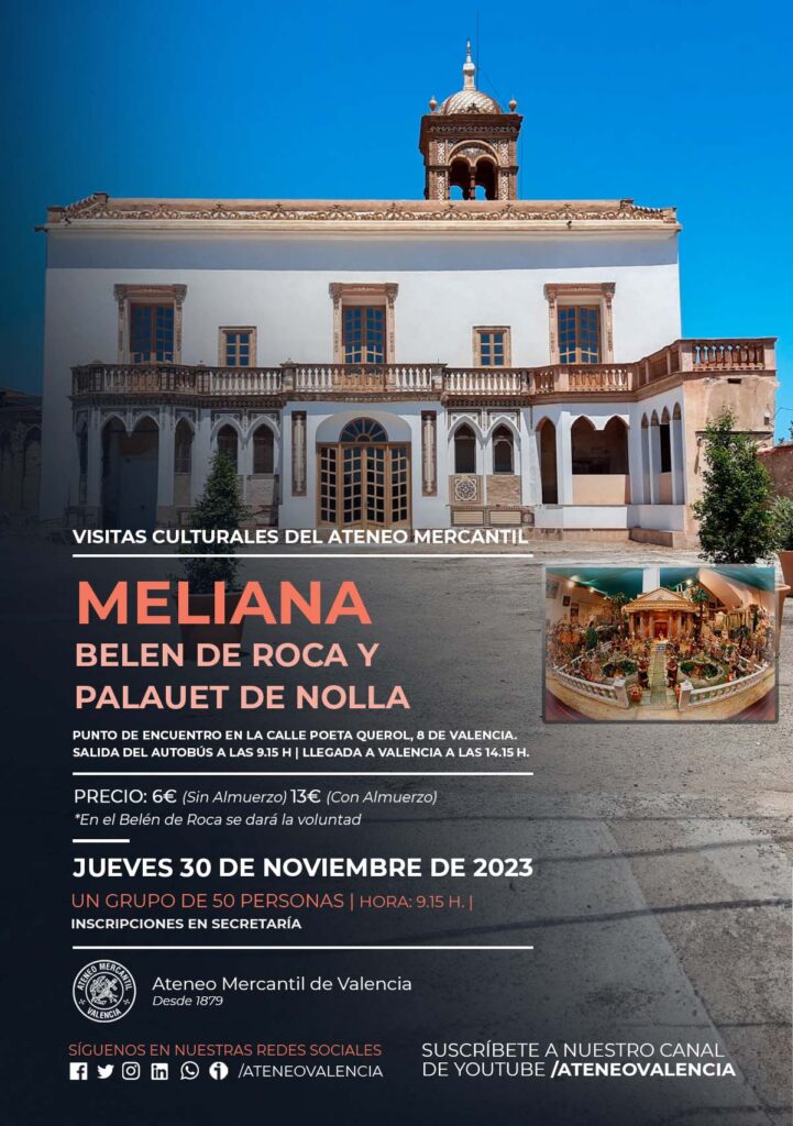 El Ateneo Mercantil de Valencia ha programado una visita cultural a Meliana el próximo jueves 30 de noviembre en la que se visitará uno de los belenes más grandes de la Comunitat Valenciana, el Belén de Roca. Además, se realizará una visita guiada por el Palauet de Nolla.