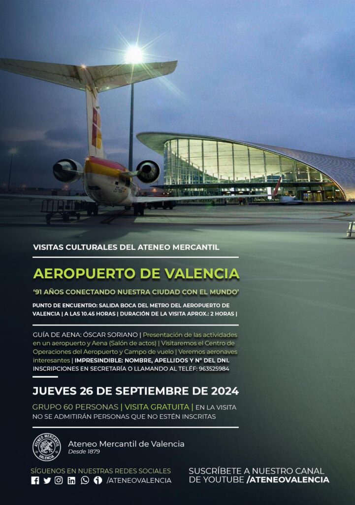 El Ateneo Mercantil de Valencia arranca el curso 2024-2025 con una nueva visita cultural guiada y GRATUITA al Aeropuerto de Valencia el próximo jueves 26 de septiembre a las 11 horas. Una instalación que cumple este año 91 años conectando nuestra ciudad con el mundo.