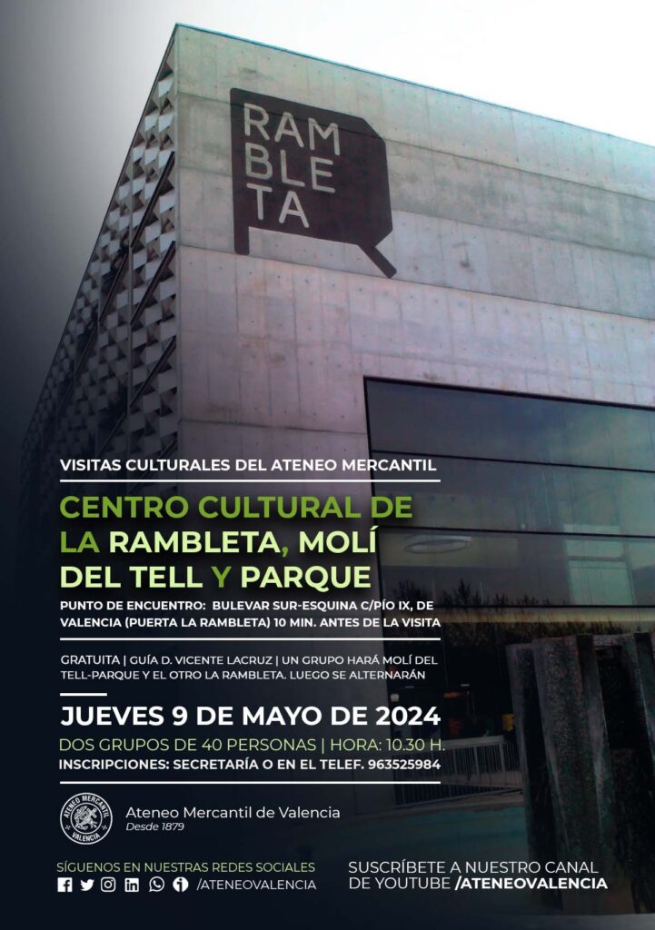 El Ateneo Mercantil de Valencia ha programado una nueva visita cultural para el mes de mayo. En esta ocasión, el jueves 9 de mayo se ha organizado una visita muy completa: al Centro Cultural La Rambleta, Molí del Tell y el Parque. La visita es para dos grupos de 40 personas, totalmente gratuita y contará con el guía del Ayuntamiento de Valencia, Vicente Lacruz.