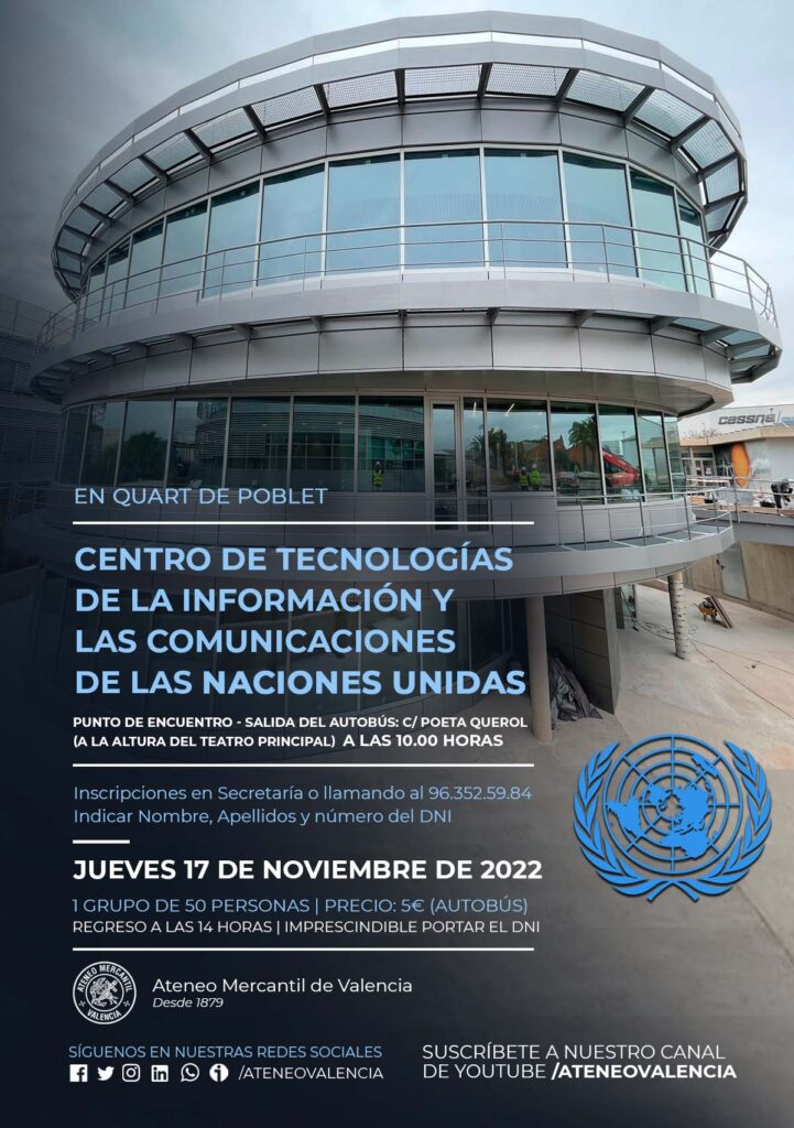 El Ateneo Mercantil de Valencia ha organizado una visita cultural para el próximo jueves 17 de noviembre de 2022 al Centro de Tecnologías de la Información y las Comunicaciones de las Naciones Unidas que está en Quart de Poblet. Una visita se realizará en autobús y el punto de encuentro para la salida será a las 10 horas en la calle Poeta Querol (a la altura del Teatro Principal).