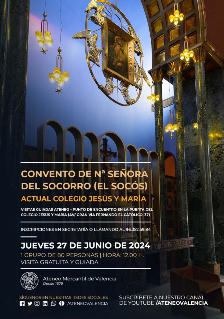 El Ateneo Mercantil de Valencia ha programado una salida cultural para el próximo jueves 27 de junio en la que se visitará el Convento de Nuestra Señora del Socorro (El Socós), que en la actualidad es el Colegio Jesús y María. Todavía se pueden visitar de lo que fue el Convento dos dependencias, la Capilla y la Biblioteca.