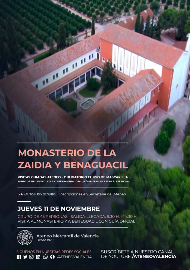Nueva visita cultural del Ateneo Mercantil de Valencia al Monasterio Cisterniense de Santa María de Gratia Dei, el Monasterio de La Zaidía de Benaguacil, el próximo jueves 11 de noviembre. La salida será a las 9.30 horas desde el punto de encuentro en la puerta del Antiguo Hospital General en la calle Guillem de Castro, 51 y la vuelta, la llegada a Valencia será a las 14.30 horas. En la visita se verá el Monasterio y la población de Benaguacil en la que habrá guía oficial.