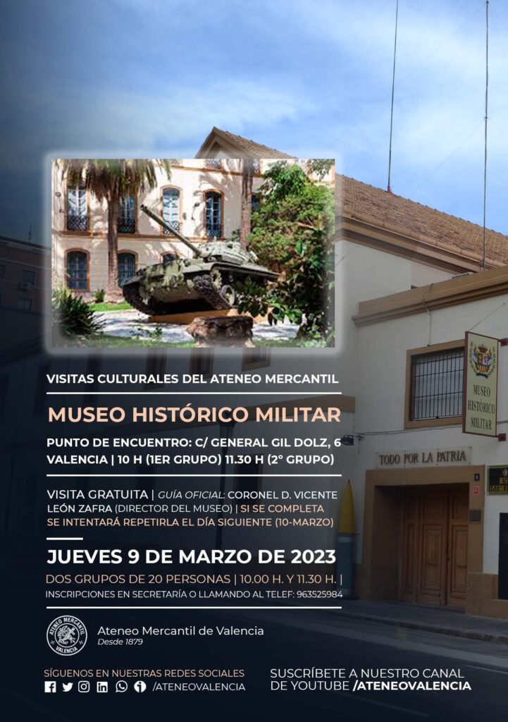 El Ateneo Mercantil de Valencia ha programado una visita cultural GRATUITA al Museo Histórico Militar de Valencia el próximo jueves 9 de marzo de 2023. Una visita que está programada para dos grupos de 20 personas: a las 10h. (primer grupo) y a las 11.30h. (segundo grupo). El punto de encuentro será en la puerta del Museo, en la calle General Gil Dolz, 6 de Valencia.
