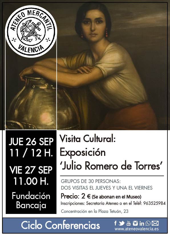 Tras el paron del verano de nuevo llegan las visitas culturales al Ateneo Mercantil. A finales de septiembre será la primera de ellas, el próximo jueves 26 de septiembre, y se vitará la exposición 'Julio Romero de Torres. Social, modernista y sofisticado' en la Centro Cultural Bancaja - Fundación Bancaja (Plaza Tetuán, 23). Ese día se han formado dos visitas: una a las 11.00 horas de la mañana y otra a las 12.00 horas y cada grupo estará formado por 30 personas. El precio de la visita es de 2 euros por persona y se pagará en la entrada al Museo.
