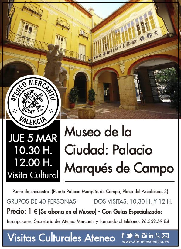 El próximo jueves 5 de marzo está programada dos visitas al 'Museo de la Ciudad: Palacio Marqués de Campo' a las 10.30 horas y a las 12 horas para 40 socios en cada una de ellas. El punto de encuentro será la puerta del Palacio, la plaza del Arzobispo, 3. Las visitas serán con guías oficiales y especializados del museo.