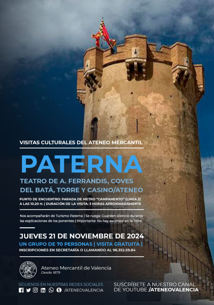 El Ateneo Mercantil de Valencia organiza una nueva visita cultural este mes de noviembre que llevará a nuestros socios hasta Paterna para conocer de cerca el Teatro de Antonio Ferrandis, les Coves del Batá, la Torre y el Casino/Ateneo. Una visita totalmente gratuita estipulada para 70 personas en la que nos acompañará el personal de Turismo Paterna.