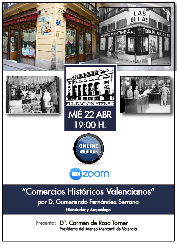 Este próximo miércoles 22 de abril a las 19 horas se llevará a cabo una nueva webinar organizada por la Fundación del Ateneo Mercantil CV sobre "Los comercios históricos valencianos" y contará con el ponente D. Gumersindo Fernández Serrano, que es historiador y arqueólogo.