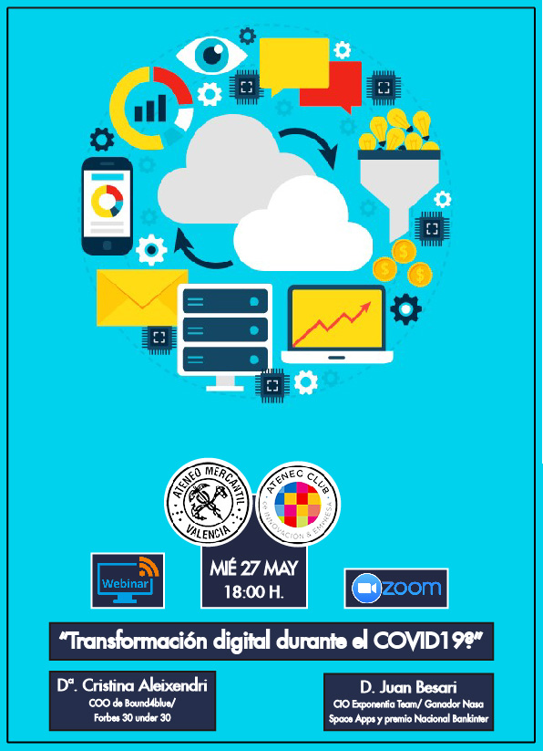 El Ateneo Mercantil de Valencia y el Ateneo Club de Innovación y Empresa han organizado una nueva webinar el próximo miércoles 27 de mayo a las 18 horas y llega con el título "Transformación digital durante el COVID19". Una mesa redonda en la que se contará con dos expertos en la materia como son Cristina Aleixendri, COO de Bound4blue/ Forbes 30 under 30, y con Juan Besari, CIO Exponentia Team/ Ganador Nasa Space Apps y premio Nacional Bankinter. Mientras que se contará con la participación del integrante de nuestro club de innovación, Vicente Gomar, Asociado Senior en Grant Thornton, que ejercerá de moderador.