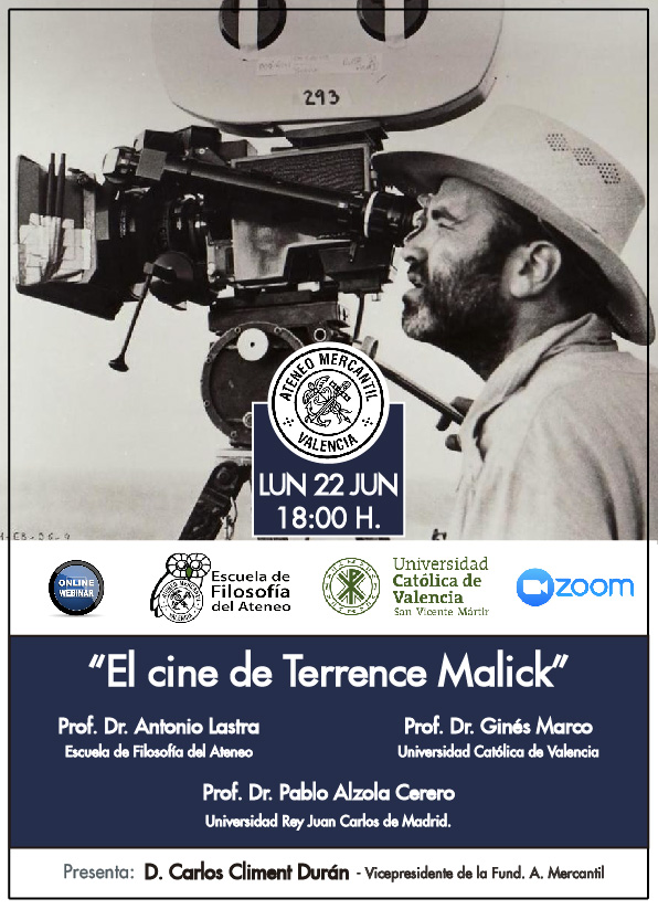El próximo lunes 22 de junio a las 18 horas el Ateneo Mercantil de Valencia junto a la Escuela de Filosofía del Ateneo han organizado una nueva webinar en colaboración con el Instituto Universitario de Investigación en Filosofía Edith Stein de la Universidad Católica de Valencia San Vicente Mártir. Una mesa de opinión que llega bajo el título: "El cine de Terrence Malick" y los ponentes serán el Prof. Dr. Pablo Alzola Cerero de la Universidad Rey Juan Carlos de Madrid, el Prof. Dr. Ginés Marco, de la Universidad Católica de Valencia y el Prof. Dr. Antonio Lastra, de la Escuela de Filosofía del Ateneo Mercatil.
