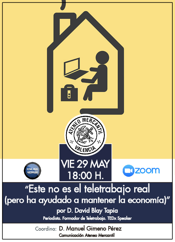 El próximo viernes 29 de mayo a las 18 horas llega una nueva webinar organizada por el Ateneo Mercantil de Valencia y lo hace para hablar y analizar un tema de candente actualidad como es la aparición del teletrabajo en este confinamiento. El título de la webinar es "Este no es el teletrabajo real (pero ha ayudado a mantener la economía)" y el ponente será un gran especialista en la materia como es D. David Blay Tapia, periodista, conferenciante y formador sobre teletrabajo. Podcaster. TEDx Speaker.