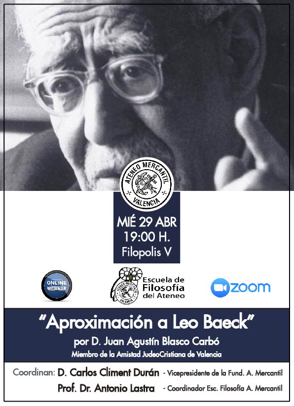El próximo miércoles 29 de abril a las 19 horas la Escuela de Filosofía del Ateneo Mercantil organiza junto a nuestra institución una nueva webinar que corresponde con la cuarta sesión de Filópolis V, lecturas de Filosofía Política. Una conferencia on line que llega bajo el título 'Aproximación a Leo Baeck' y se desarrollará gracias a las aportaciones de D. Juan Agustín Blasco Carbó. El ponente es miembro de la Amistad JudeoCristiana de Valencia y acercará la vida de este rabino alemán del siglo XX, erudito, y uno de los líderes del Judaísmo reformista.