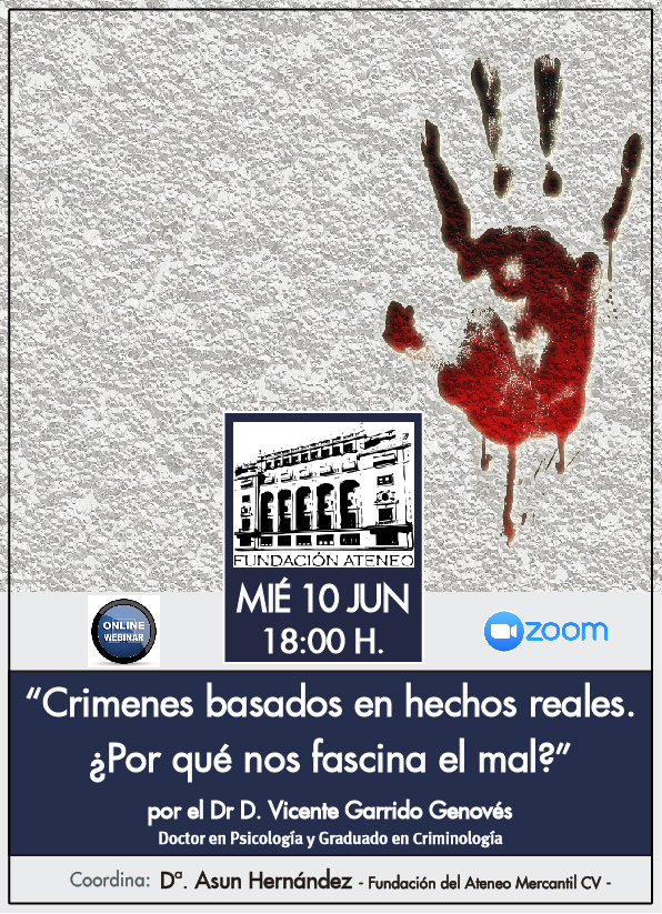 La Fundación del Ateneo Mercantil CV ha organizado una nueva webinar el próximo miércoles 10 de junio a las 18 horas sobre crímenes que se engloba dentro de nuestro Foro de Justicia y Criminología que trae el Doctor en Piscología y graduado en Criminología, el Dr. D. Vicente Garrido Genovés. La webinar llega bajo el título: "Crímenes basados en hechos reales. ¿Por qué nos fascina el mal?".