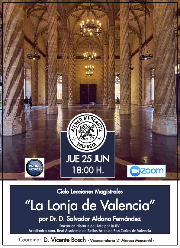 El Ateneo Mercantil de Valencia ha organizado una nueva webinar el próximo jueves 25 de junio a las 18 horas que está englobada en el Ciclo Lecciones Magistrales y llega bajo el título: "La Lonja de la Seda de Valencia". El ponente será un viejo conocido de nuestra entidad como es el Doctor en Historia del Arte por la UV y académico numerario de la Real Academia de Bellas Artes de San Carlos de Valencia, D. Salvador Aldana.