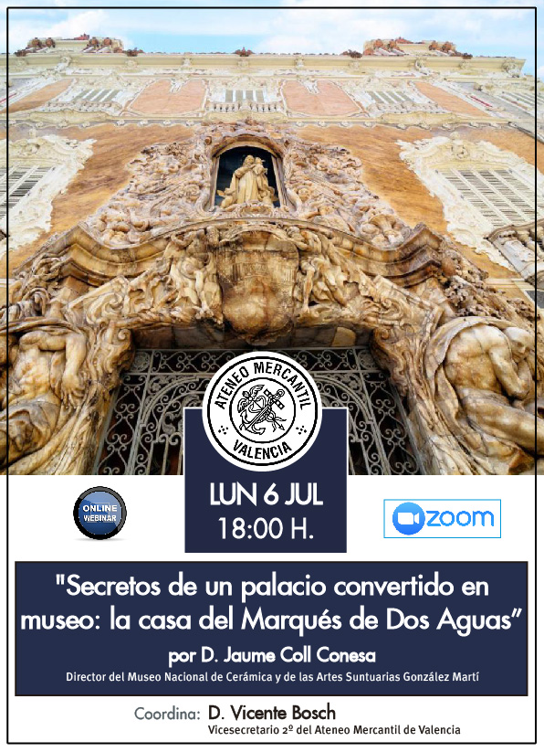 El Ateneo Mercantil de Valencia ha organizado una nueva webinar dentro del Ciclo de Conferencias que llega el próximo lunes 6 de julio a las 18 horas bajo el título: "Secretos de un palacio convertido en museo: la casa del Marqués de Dos Aguas" y que contará con la presencia de un ponente especializado como es D. Jaume Coll Conesa, que es el director del Museo Nacional de Cerámica y de las Artes Suntuarias González Martí.