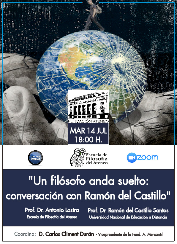 La Escuela de Filosofía del Ateneo Mercantil y la Fundación del Ateneo Mercantil CV han organizado un último evento de filosofía en este curso 2019-20. Una webinar que será una conversación entre el filósofo y profesor de la Universidad Nacional de Educación a Distancia, el Prof. Dr. Ramón del Castillo, y el Prof. Dr. Antonio Lastra de la Escuela de Filosofía del Ateneo Mercantil de Valencia. La conferencia llega bajo el título: "Un filósoso anda suelto: conversación con Ramón del Castillo". Coordina el acto D. Carlos Climent, vicepresidente de la Fundación del Ateneo Mercantil de Valencia.