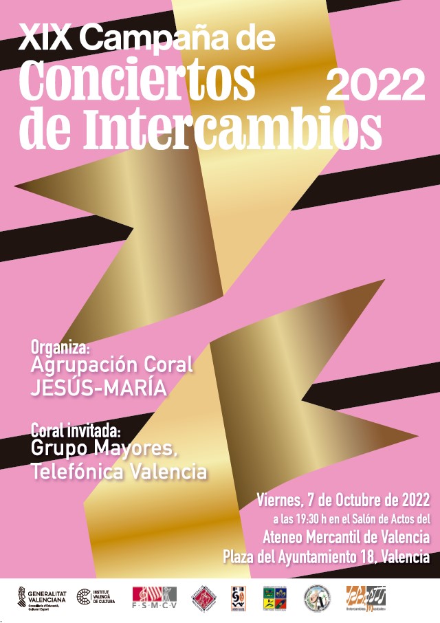 Llega hasta nuestra institución la XIX Campaña de conciertos de intercambio 2022 el próximo viernes 7 de octubre a las 19.30 horas en el Salón de Actos del Ateneo Mercantil de Valencia. Un concierto que organiza la Agrupación Coral Jesús-María y que contará con una coral invitada para la ocasión que es la del Grupo Mayores Teléfonica Valencia. Entrada gratuita hasta completar el aforo del teatro.