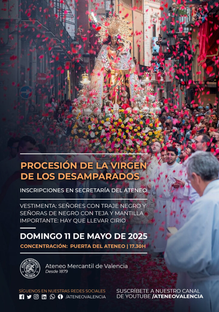 El Ateneo Mercantil de Valencia vuelve a participar con devoción en la tradicional procesión en honor a la Mare de Déu dels Desamparats, patrona de la ciudad. Cada segundo domingo de mayo, miles de valencianos rinden homenaje a "La Geperudeta", una figura profundamente arraigada en la cultura y el corazón del pueblo.