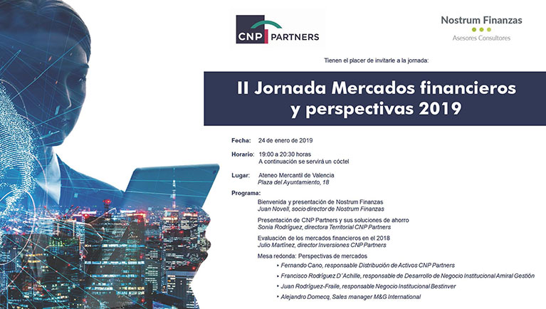 El próximo jueves 24 de enero se desarrollará la II Jornada de Mercados Financieros y perspectivas para 2019, que organiza Nostrum Finanzas y CNP Partners en el Salón Sorolla a las 19 horas. La conferencia […]