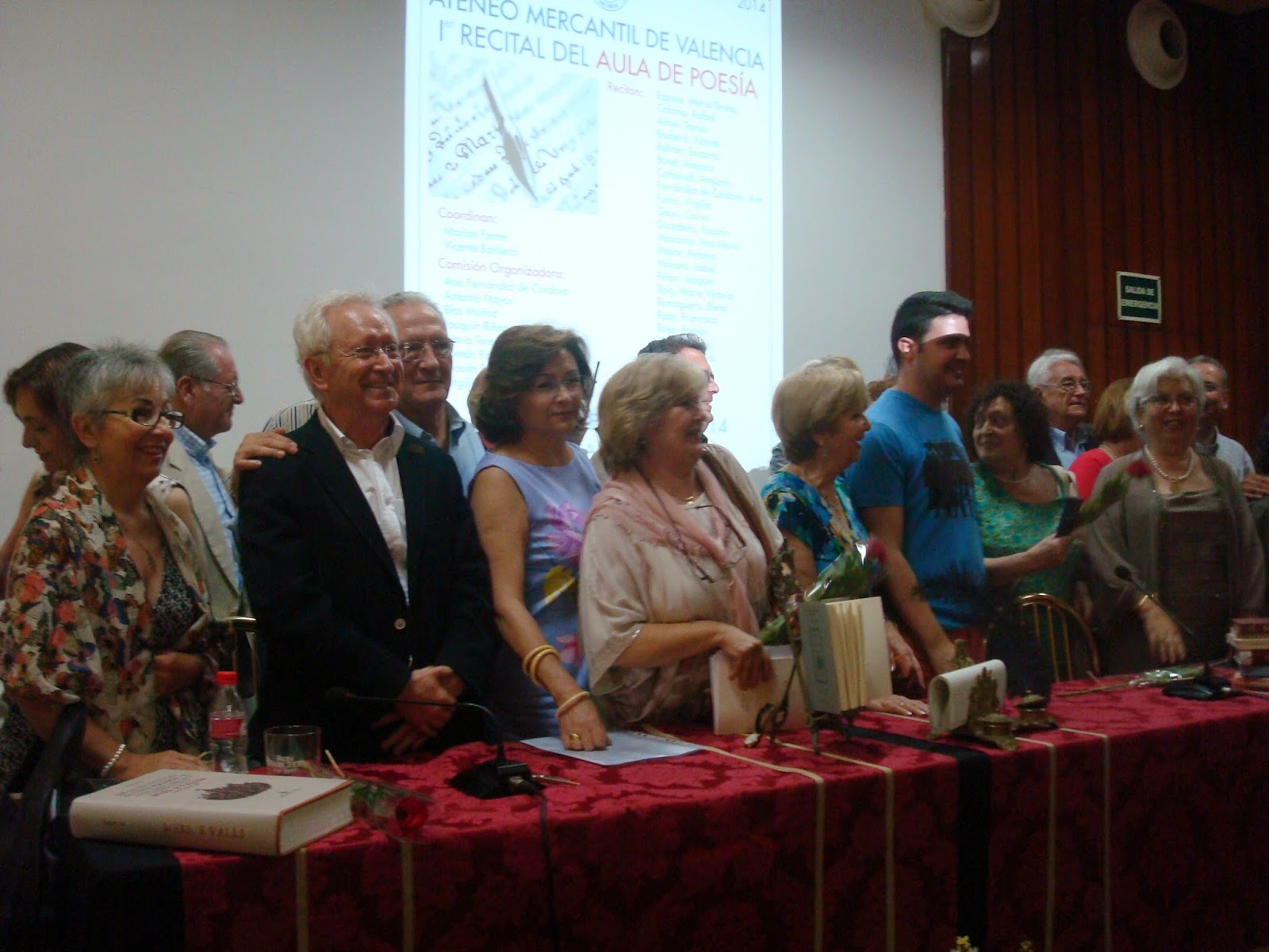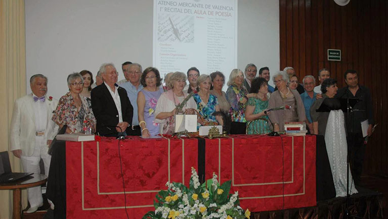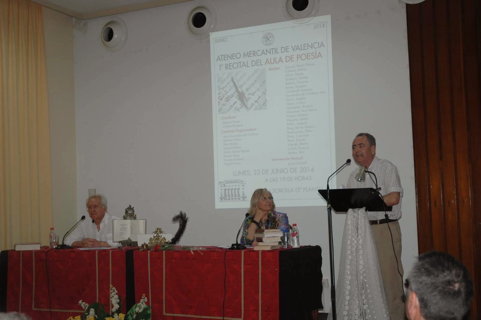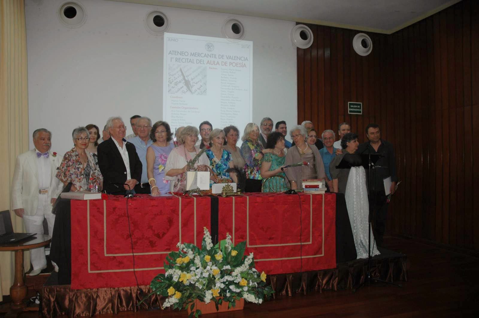 Una comisión organizadora preparó los detalles del recital en el que intervinieron 20 poetas que recitaron un solo poema y el músico Lucas Granell con tres magníficas piezas para violín. La mayoría de los poetas recitaron obra propia y forman parte del Aula de Poesía que cuenta con un número limitado a 25 miembros. Como invitados intervinieron grandes poetas como Rafael Coloma, Encarna Beltrán, Concha Gauxí, Isabel Moyano, Pascual Casañ, María Vicente, Amparo Bonet y Rosario Guardeño. Como miembros del Aula: María Teresa Espasa, Tomás Almer, Vicente Barberá, Amparo Carbonell, Ana Fernández de Córdova, Virgilio Fuero, Antonio Mayor, Joaquín Riñón, Elena Romaguera, Francisco Rossi, Román Royo y Blas Muñoz. El salón Sorolla cubrió todo el aforo y puede afirmarse que este primer recital del aula fue todo un éxito que corona una labor, que en sólo seis meses ya da sus frutos.