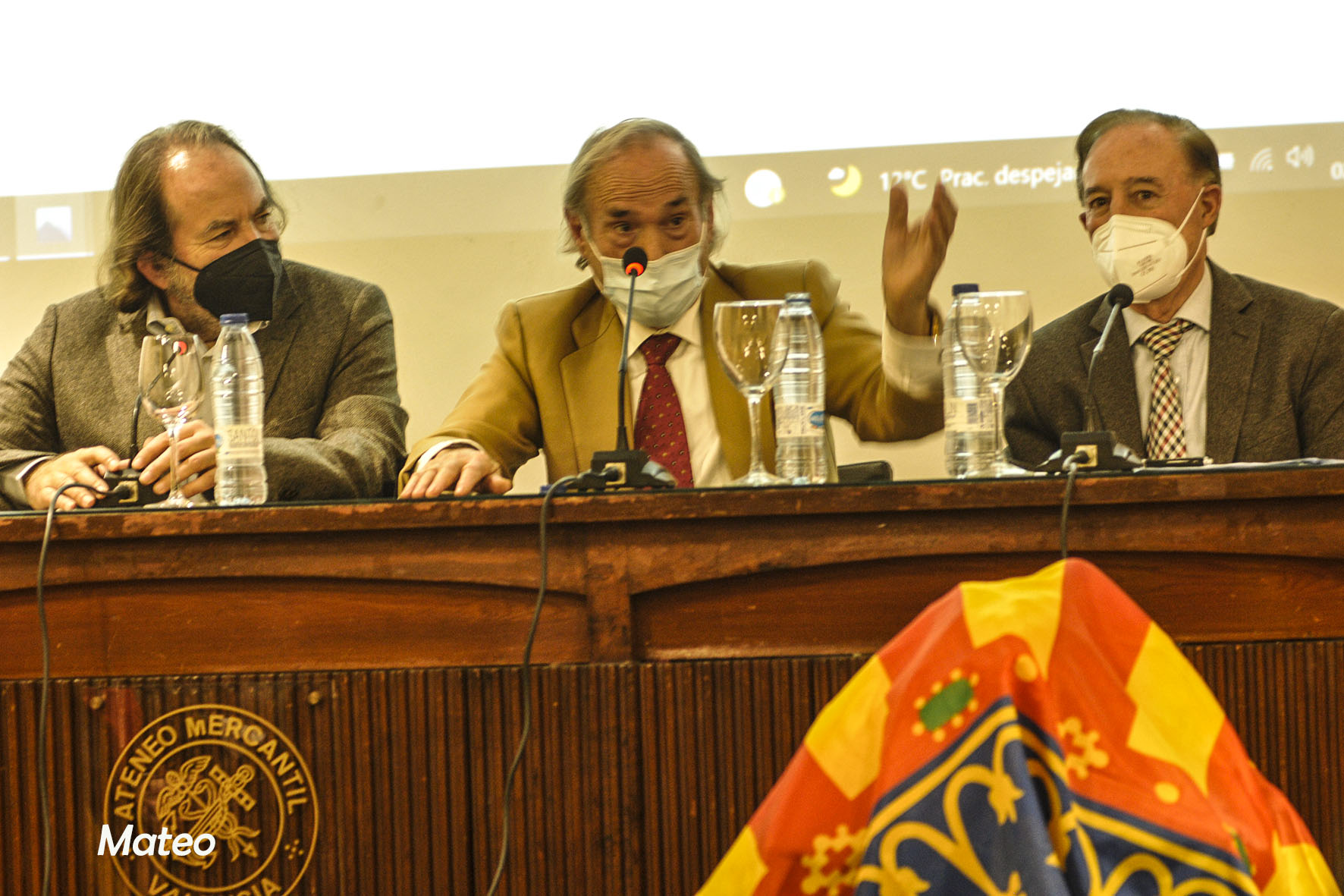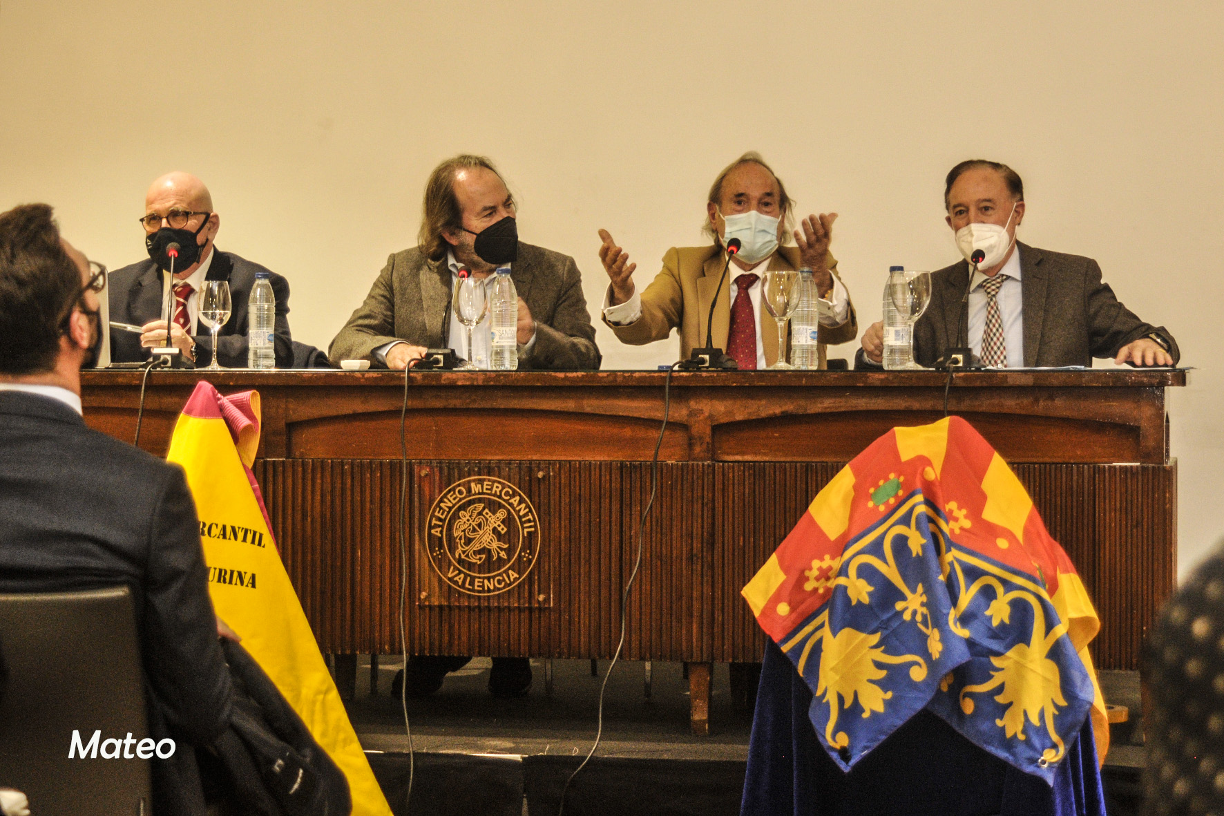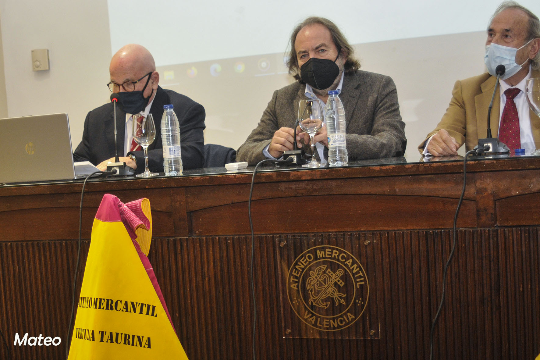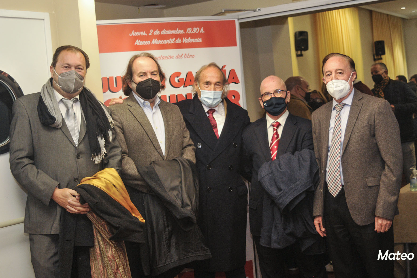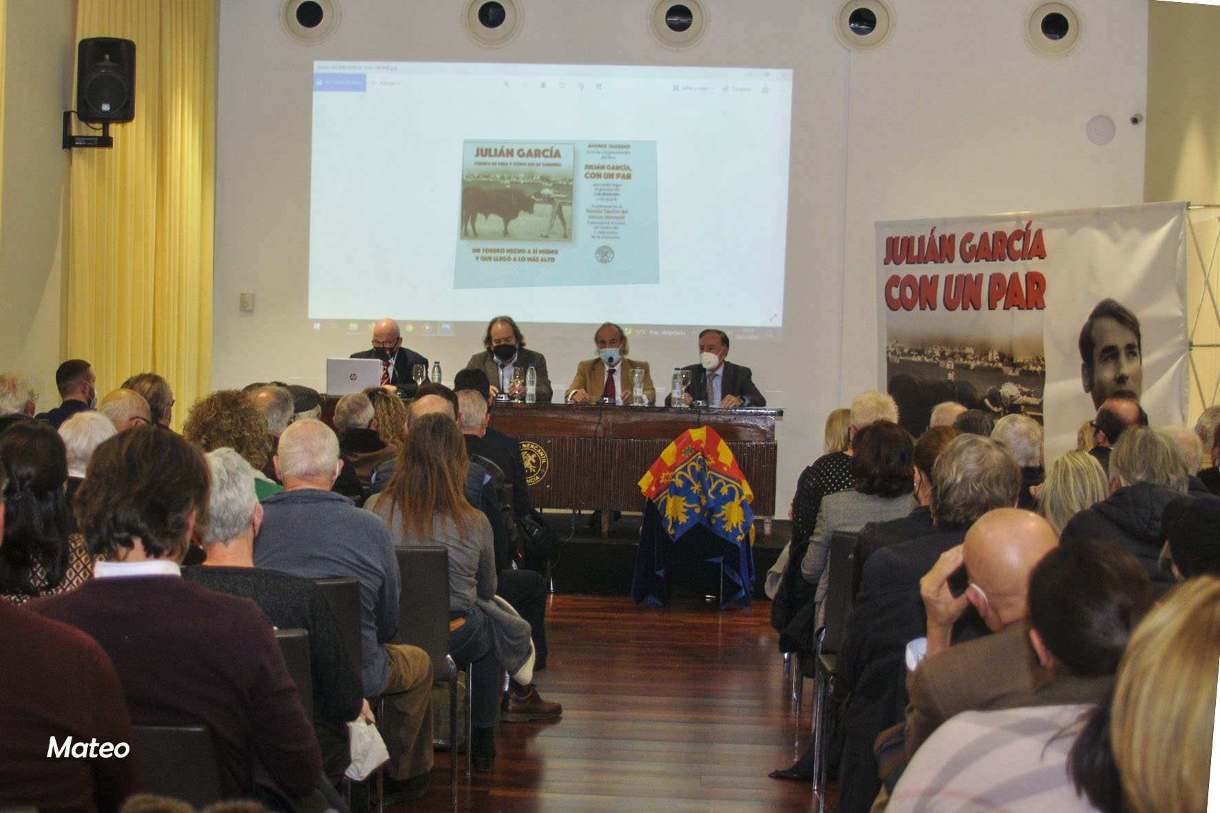 Al acto junto a un gran número de aficionados y amigos, asistieron: D. Enrique Mora Rubio, vicesecretario del Ateneo Mercantil y responsable de la Tertulia Taurina ante la junta directiva, una veintena de tertulianos encabezados por los miembros de la comisión Nicasio Jiménez y Salvador Chapa, críticos y fotógrafos taurinos, el abogado y gran aficionado a los toros D. Ricardo Martínez Valls, quien ha escrito el prólogo del libro presentado, Pilar, la esposa del homenajeado, sus hijos y su nieto Mateo. En el estrado junto a Julián García, los escritores del libro "Con un Par", Paco Delgado y Luis Miguel Sánchez y el portavoz de la Tertulia Taurina del Ateneo Mercantil, Paco Roger, que presentó y moderó el acto.