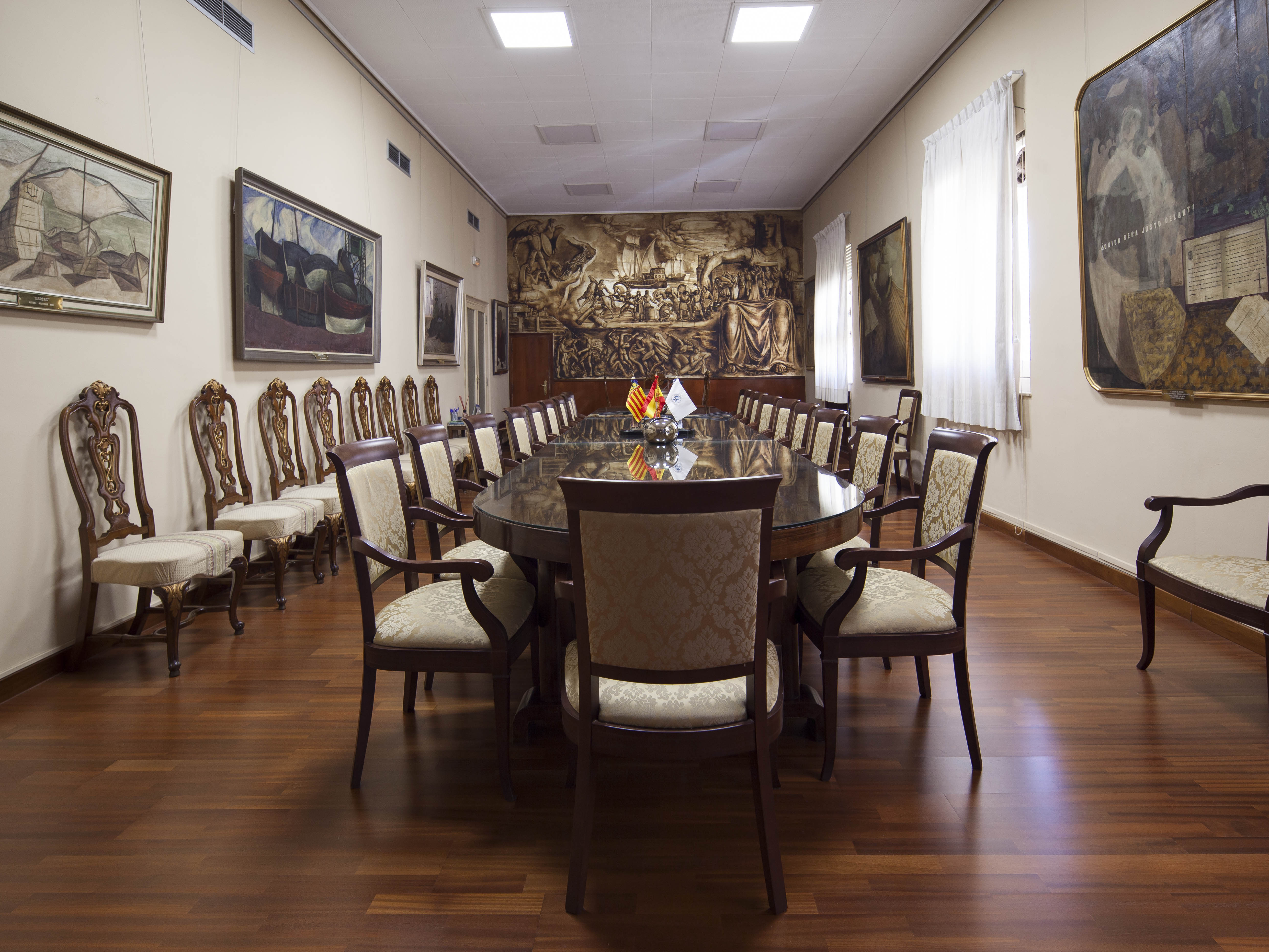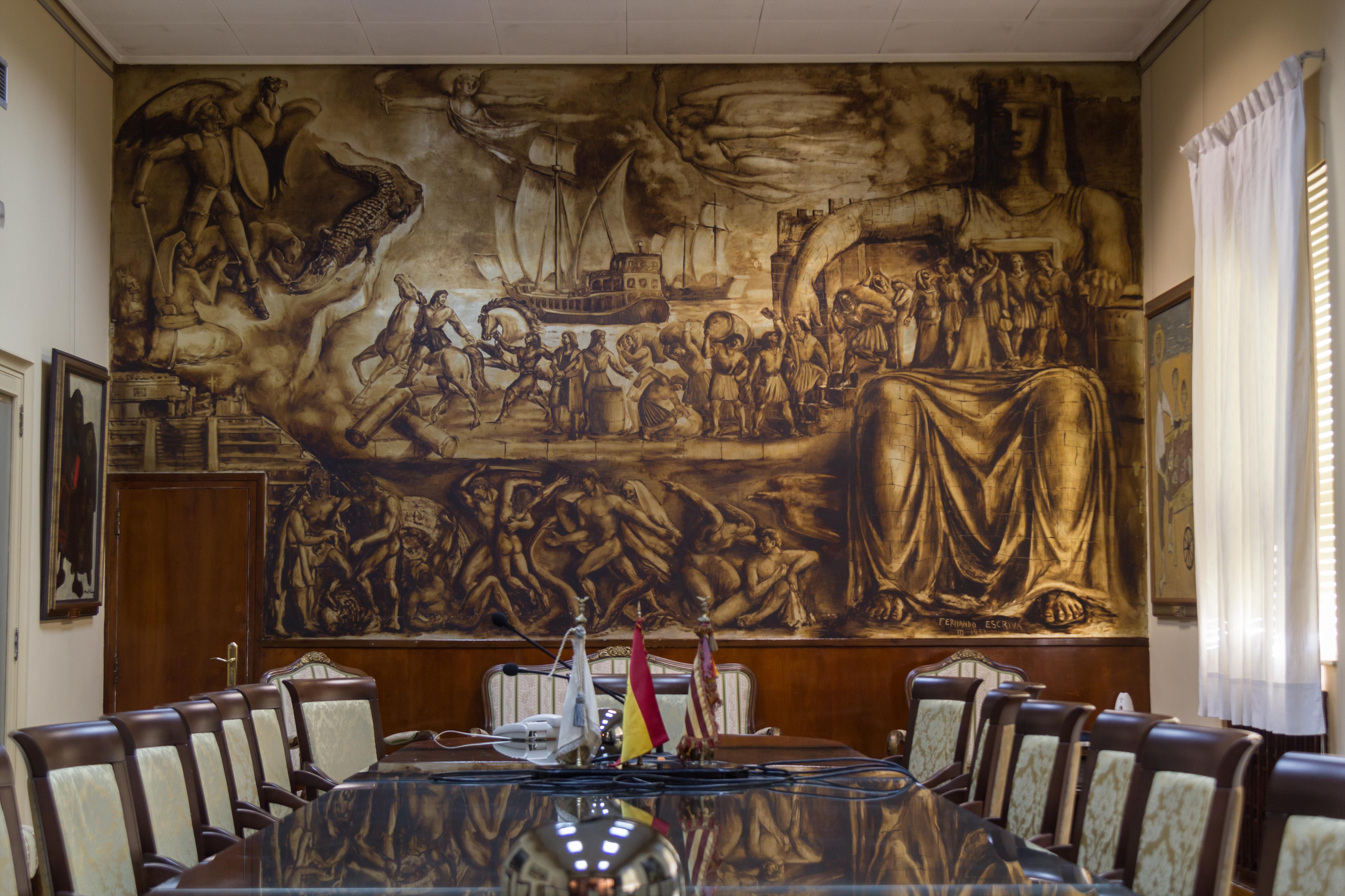 Este singular espacio está decorado, entre otras obras, con un gran fresco a la cera, de Escrivá, que representa la Gloria de España sobre el enfoque del descubrimiento de América. Aunque en los últimos ya cuelgan de las paredes de la Sala de Juntas, varias de las obras que resultaron ganadoras del principal Certamen de Pintura de nuestra casa, el Salón de Otoño. Así que conviven en un mismo espacio obras clásicas con otras más modernas que conforman un visual colorido.