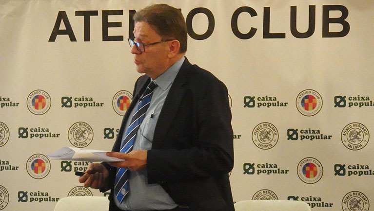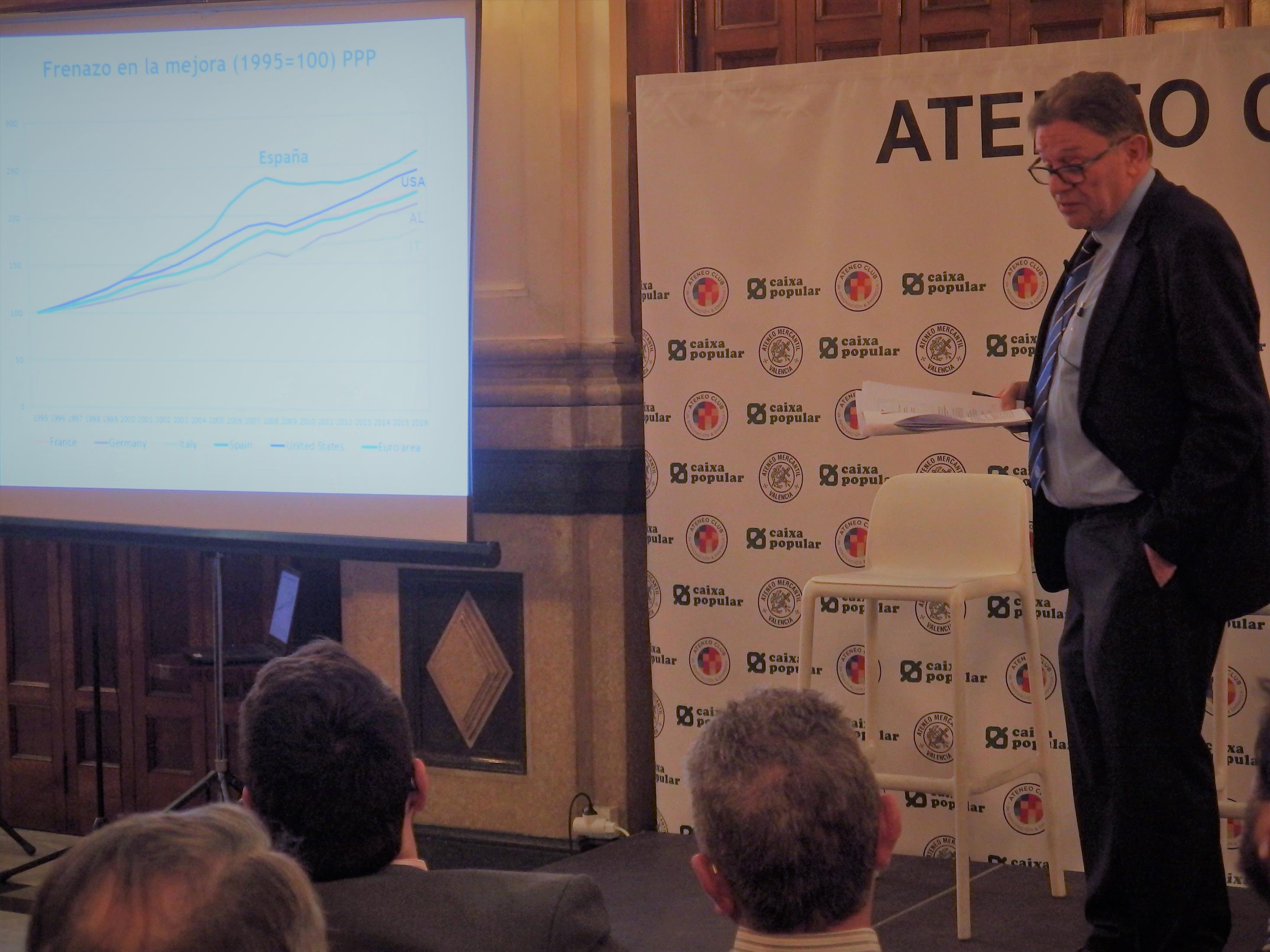 Inició su conferencia realizando una comparativa de la crisis económica de los años 92-93 con la de 2009-2013 y sus efectos en la Comunidad Valenciana. Destacó que a pesar de los esfuerzos de esta Comunidad los efectos han sido si cabe más devastadores que en el resto de España haciendo un análisis por los indicadores económicos que demuestran esta realidad. Destacó la necesidad que tienen los actores económicos valencianos de invertir en innovación tecnológica y capital humano por ser estos factores intangibles los que a futuro se demuestra que tienen mayor impacto en el crecimiento de la economía. Respecto a las claves facilitadoras para el futuro, destacó entre otras: