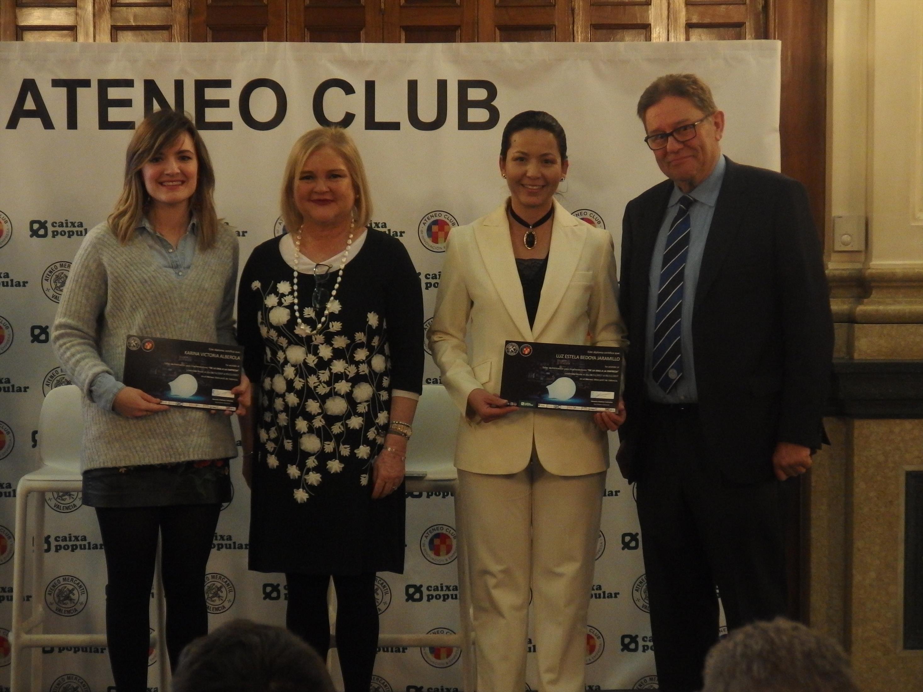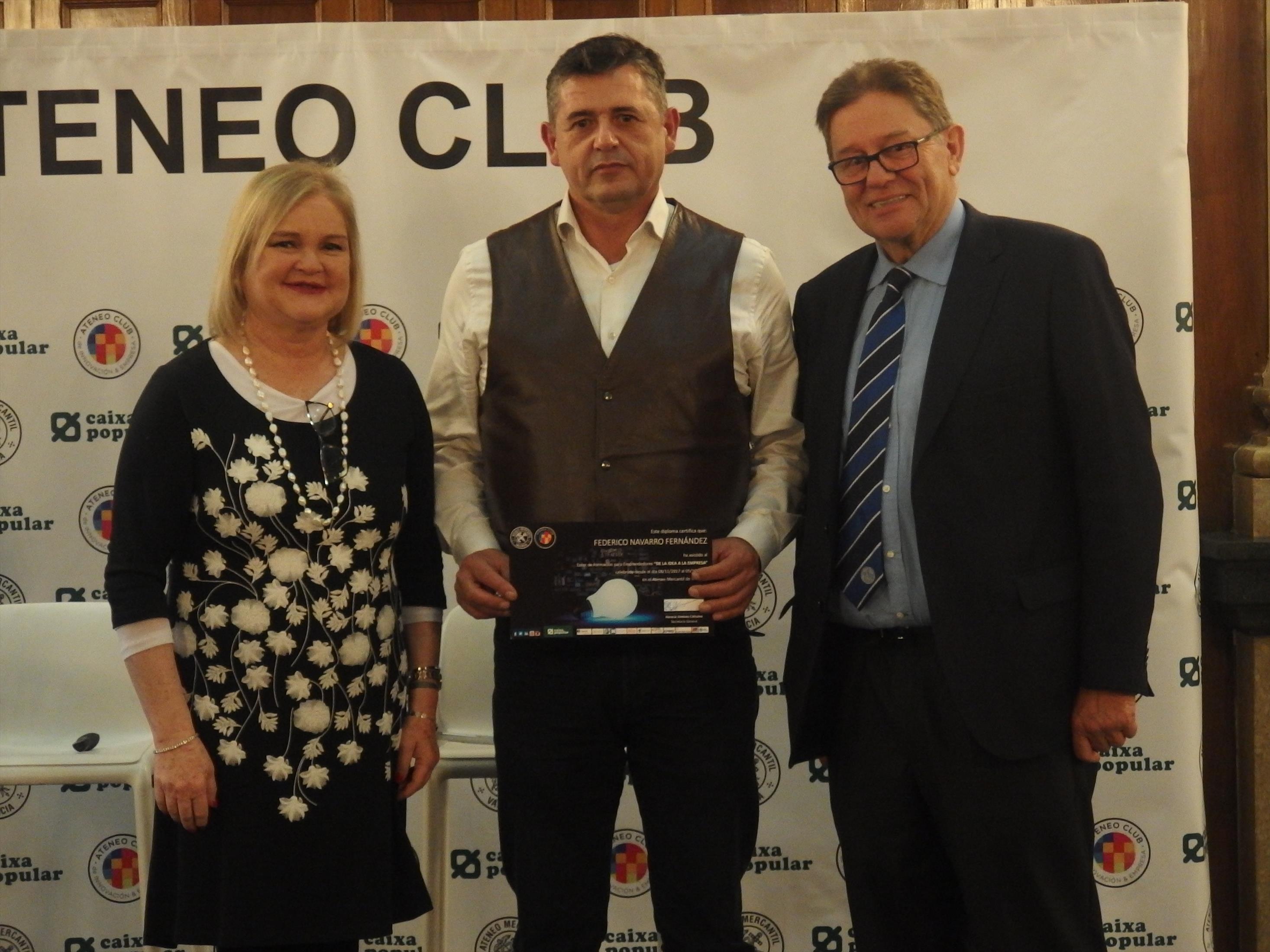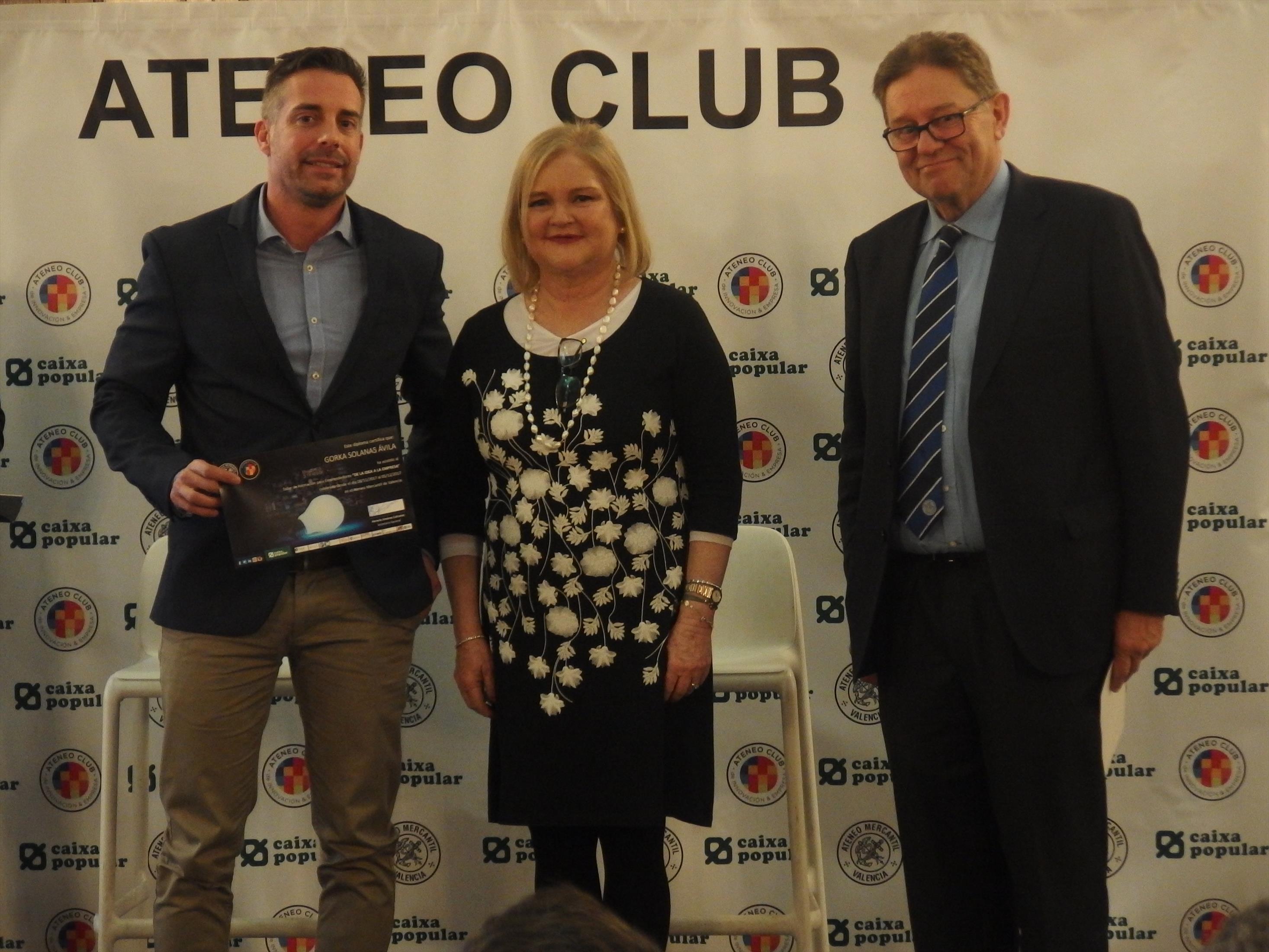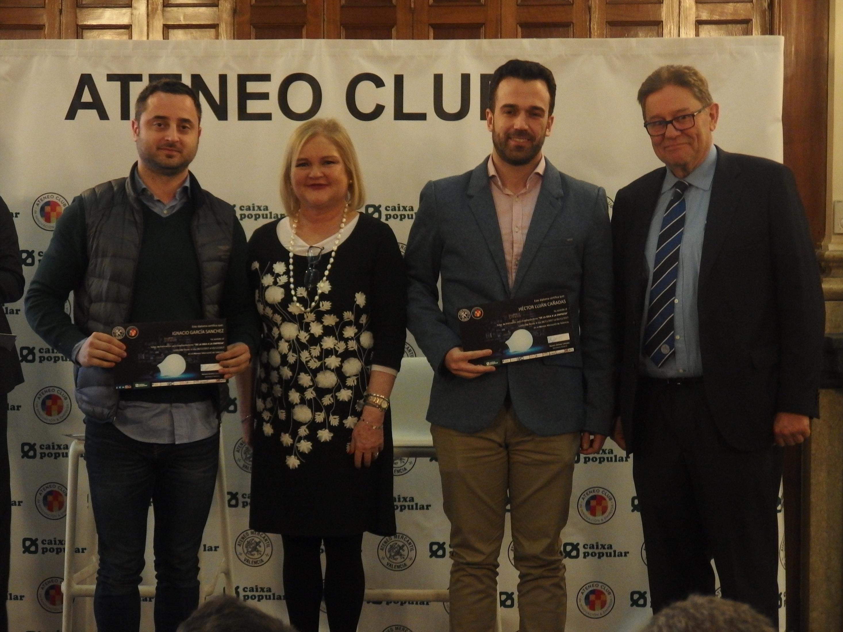 A continuación intervino Juan García Sánchez presentando en sociedad el Ateneo Club de Innovación y Empresa y las actividades que lleva cabo y finalizó el acto con la entrega de diplomas a los participantes del taller y la intervención de la presidenta del Ateneo Mercantil de Valencia Dña. Carmen de Rosa que destacó la importancia de la formación de los emprendedores valencianos a la que Ateneo contribuye con sus actividades.