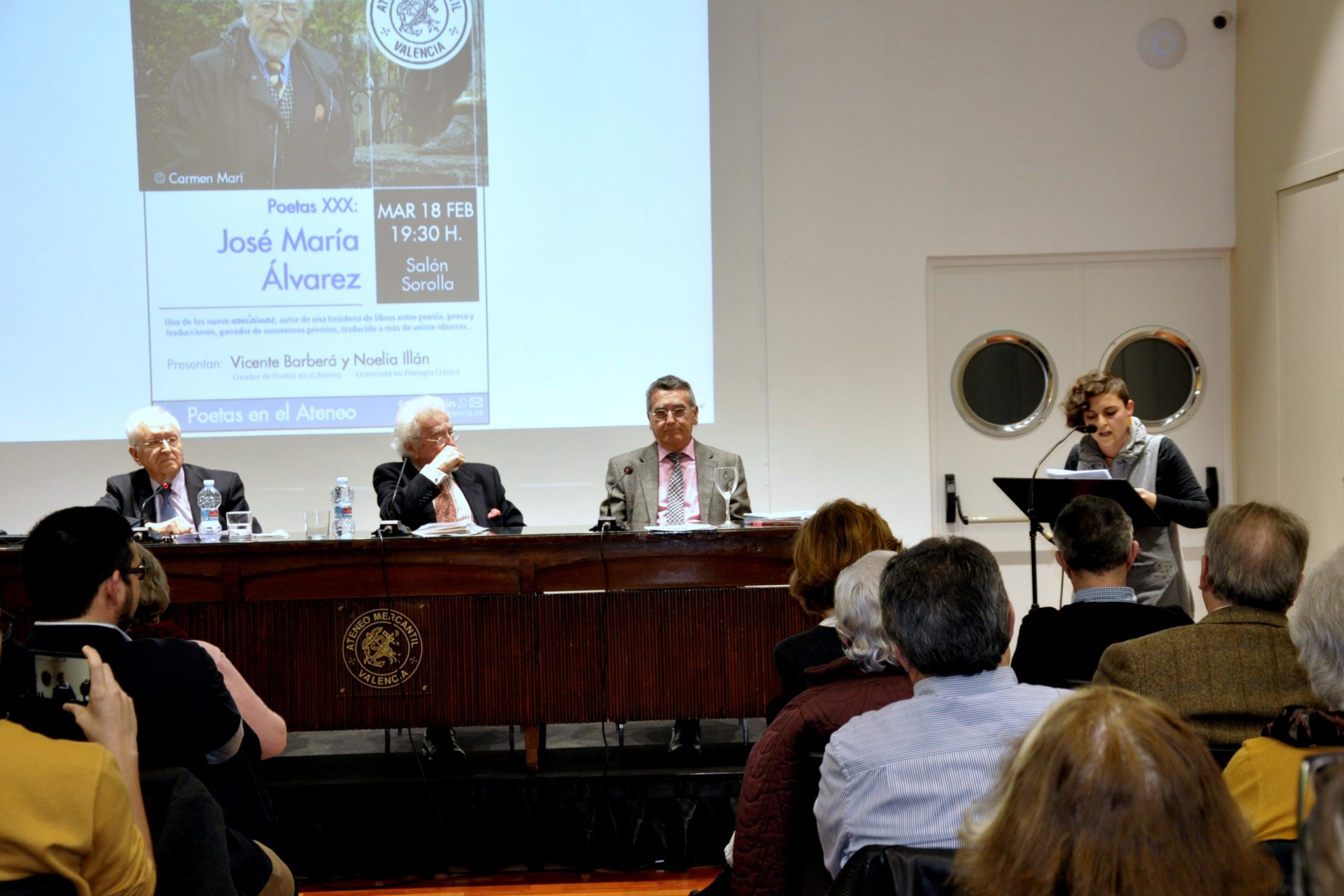 En segundo lugar, se procedió a iniciar la sesión dedicada propiamente a “Poetas en el Ateneo”, bajo la presentación de Vicente Bosch y la dirección de Vicente Barberá, a quienes también hay que felicitar, porque han conseguido que esta iniciativa esté ya en su treintava edición, lo cual es todo un logro. Tomó la palabra de nuevo Noelia Illán para ahondar en la trayectoria poética de José María Álvarez, del que dijo que era un poeta honesto en su poesía, en el conjunto de su obra y en su vida, y fue desgranando algunos aspectos de la trayectoria de poeta: